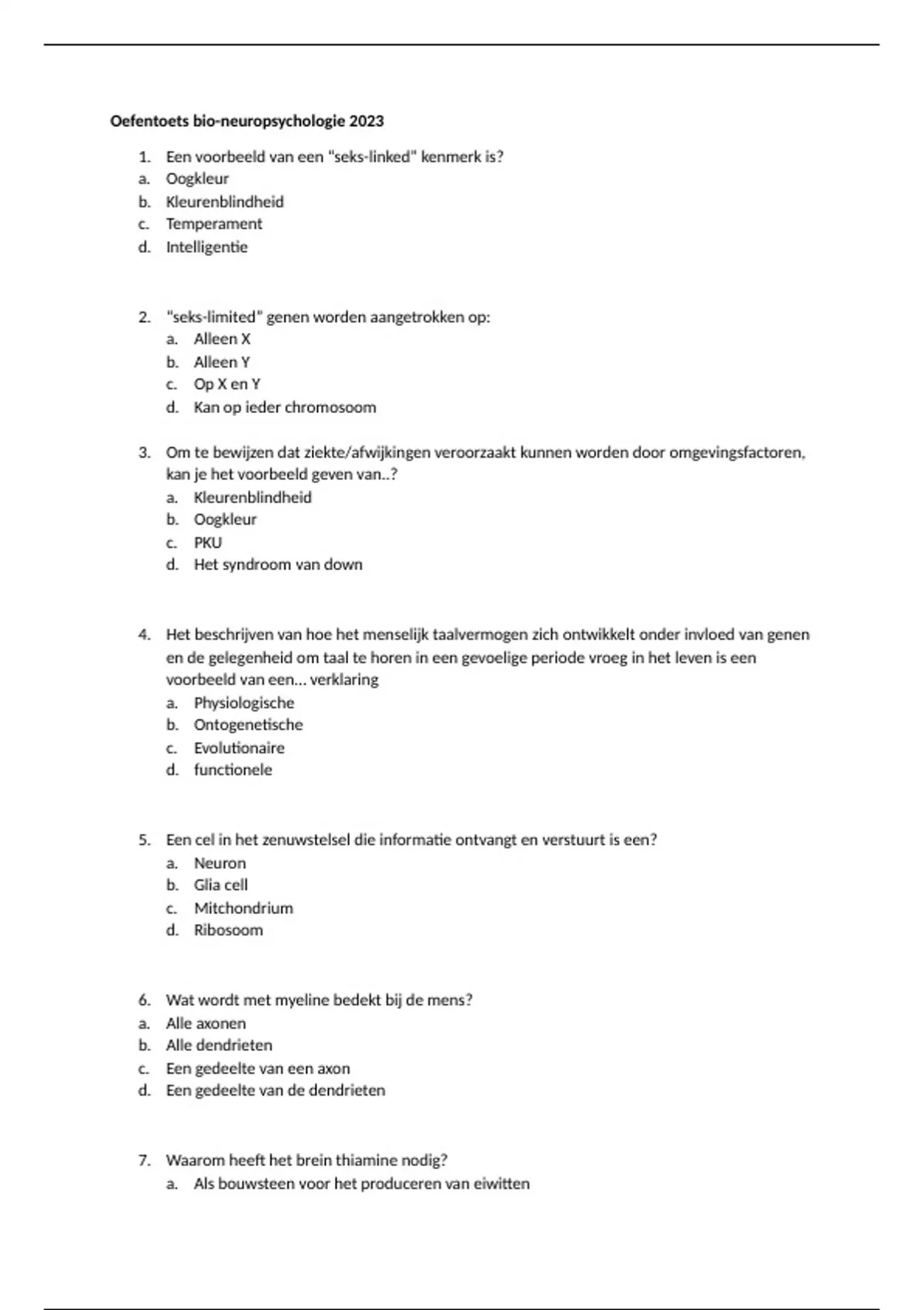 Oefentoets bio-neuropsychologie 2023
