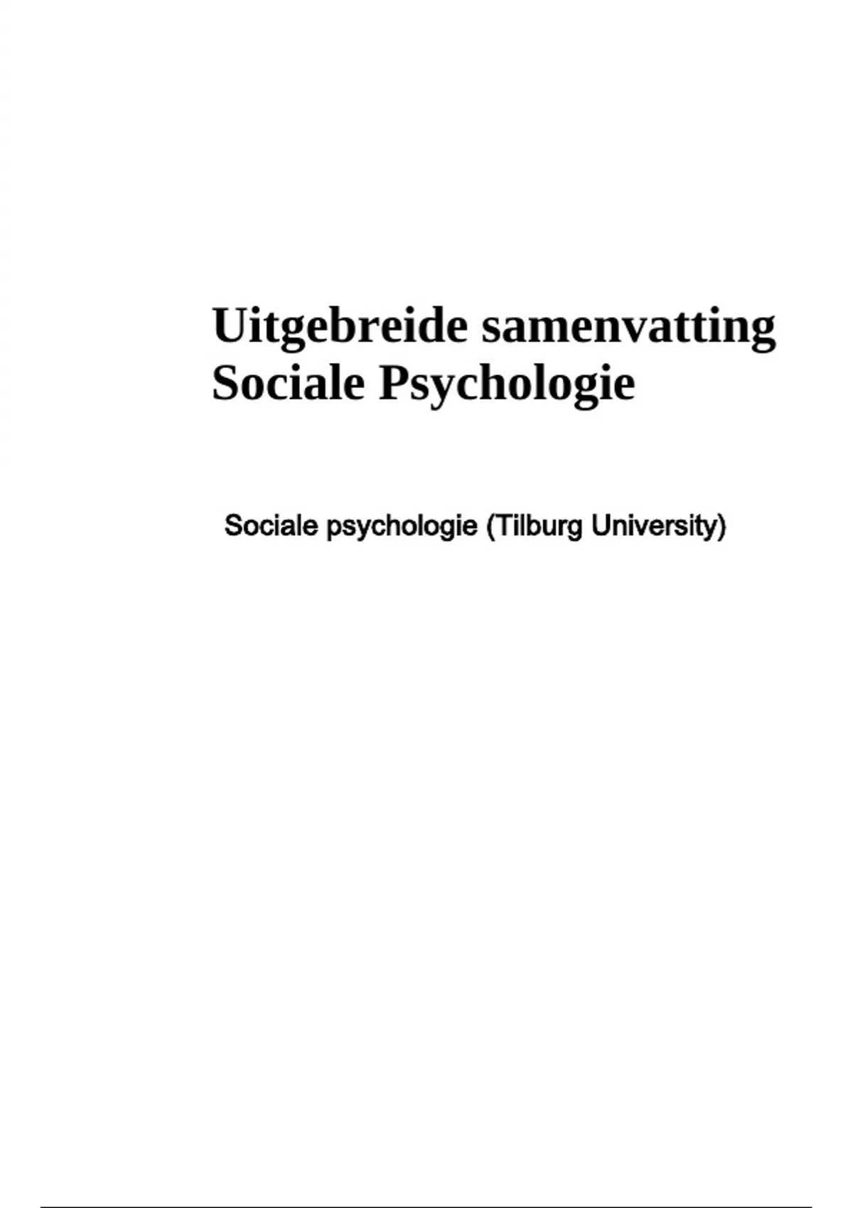 Uitgebreide samenvatting Sociale Psychologie. Chapter 1: Introduction to Social Psychology Chapter 2: The Person and the Situation Sociale psychologie bestudeert  individuen, individuen in een groep & individuen in een groep in een situatie  omschrijven en uitleggen (theorieën) theorie: een wetenschappelijke uitleg Onderzoek naar drie aspecten: cognitie, affect en gedrag Vergelijkingen: binnen personen, tussen personen, binnen groepen & tussen groepen Sociale psychologie: bestudeert de manier waar op de gevoelens, cognities en het gedrag van mensen beïnvloed worden door de impliciete dan wel expliciete aanwezigheid van andere mensen. 4 perspectieven:  Evolutionair perspectief: zoekt de oorzaken van sociaal gedrag in de fysieke en psychologische predisposities die onze voorouders hielpen om te overleven en te reproduceren  Sociaal-cultureel perspectief: de theoretische perspectief dat onderzoek doet naar de oorzaken van sociaal gedrag en hoe dit grotere sociale groepen beïnvloed  onderzoek naar krachten in grotere sociale groepen. Niet zozeer geïnterresseerd in specifieke gevallen en hun unieke ervaringen zoals het sociaal-leren perspectief. Focus op de sociale norm in de cultuur, normen kunnen snel veranderen. Gericht op OMGEVING  Sociaal-leren perspectief: focus op de geschiede lee ervaringen als voorspelling van het sociaal gedrag van een persoon  belonen en straffen. Focus of de unieke ervaringen in een bepaalde familie, school of groep van gelijken. Gewoontes zijn moeilijk te breken. gericht op OMGEVING  Sociaal-cognitief perspectief: focus op de mentale processen die betrokken zijn bij het aandacht geven aan, interpreteren van en het onthouden van sociale ervaringen De uitvinding van de computer leidde tot de cognitieve revolutie: een herleving van de interesse in de werking van de geest Basis principes: 1. Sociaal gedrag is doelgericht: mensen interacteren met anderen om doelen voor elkaar te krijgen  Om sociale relaties aan te gaan  Om onszelf en anderen te begrijpen  Om een status te verkrijgen en te behouden  Om onszelf te verdedigen en hen waarom te geven  Om partners aan te trekken en te behouden 1. Sociaal gedrag is een voortdurende interactie tussen persoon en situatie Lewin  focus op subjectieve interpretaties, ligt aan de doelen die iemand heeft  leidt tot associatie met cognitieve psychologie Wat ons drijft:  Doelen zijn hiërarchisch geordend (Kenrick et al) Welke doelen heb je voor vandaag? Welke doelen heb je voor dit semester? Herschrijving Sociale Psychologie Christel van Kakerken 2 lOMoARcPSD| Welke doelen heb je voor je carrière? Welke doelen heb je voor je leven? 1. Fysiologische behoeftes 2. Jezelf en dierbaren beschermen 3. Erbij horen 4. Status/eigenwaarde 5. Het vinden van een partner 6. Het behouden van een partner 7. Kind krijgen  Doelen sturen gedrag (zelfregulatie) Soms falen we…  onderdrukken Persoon: kenmerken of karakteristieken die individuen meenemen in sociale situaties Omgeving: omgevingsgebeurtenissen of omstandigheden buiten de persoon om Persoon-situatie interactie o Niet iedereen reageert hetzelfde in dezelfde in dezelfde situatie o Mensen kiezen situaties (en omgekeerd) o Mensen veranderen de situatie (en omgekeerd) o Verschillende situaties activeren verschillende aspecten van het zelf o Elke situatie heeft verschillende facetten, welk sociaal motief actief is, is afhankelijk van welk aspect aandacht krijgt  1. Het denken, doel en voelen van mensen wordt sterk beïnvloed door de situatie en hun interpretatie van de situatie  Milgram (1963)  Darley & Latané: het bijstander effect Diffusion of responsibility (Darley & Latané, 1968) Pluralistic ignorance (Latané & Robin, 1969)  2. Mensen onderschatten de invloed van de situatie op het gedrag van anderen, en soms ook op hun eigen gedrag Overjustification effect: onderschatting effect van beloning (Lepper et al;, 1973). De neiging tot het spontaan vertonen van bepaald gedrag is lager wanneer je voor het vertonen van dat gedrag beloond wordt. Correspondence bias (fundamentele attributiefout): onderschatting van de rol van de situatie Correlationeel versus experimenteel onderzoek  verschillen in  Efficiëntie  Oorzaak en gevolg  Controle Herschrijving Sociale Psychologie Christel van Kakerken 3 lOMoARcPSD| Confound: een variabele die systematisch samen met de onafhankelijke variabele verandert, wat kan leiden tot een potentiële verkeerde conclusie over de onafhankelijke variabele Random assignment: het op een dusdanige manier toewijzen van proefpersonen dat elke subject een gelijke kans heeft om in elke conditie aanwezig te zijn  definieert een experiment Demand characteristics: hints die ervoor zorgen dat de proefpersoon kan bepalen wat de hypothese is van het onderzoek Veldexperimenten: studies zonder dat de proefpersonen weten dat ze deelnemen (oplossing voor nepheid en demand characteristics) Betrouwbaarheid: een onderzoek is betrouwbaar als de resultaten consistent zijn Ethische problemen  oplossing – debriefing Ethische problemen voor onderzoekers zijn bijvoorbeeld invasie van privacy en mogelijk letsel voor participanten. Institutionele reviewboards en professionele handleidingen vermijden dit. Validiteit Interne validiteit: de mate waarin een experiment het mogelijk maakt om betrouwbare beweringen over oorzaak en gevolg te maken Externe validiteit: de mate waarin de resultaten van een experiment kunnen worden gegeneraliseerd naar andere omstandigheden Omschrijving Sterkte Zwakte Descriptieve correlationele methodes: Naturalistische observatie: Onwetende opname van het gedrag zoals het natuurlijk voorkomt. - spontaan gedrag - ligt niet aan de bekwaamheid van mensen om hun eigen ervaringen te melden - onderzoekers kunnen het gedrag storen - sommige interessante gedragingen zijn erg zeldzaam Case studies: Intensieve onderzoek van één enkel persoon of één groep - rijke bron van hypotheses - laat o