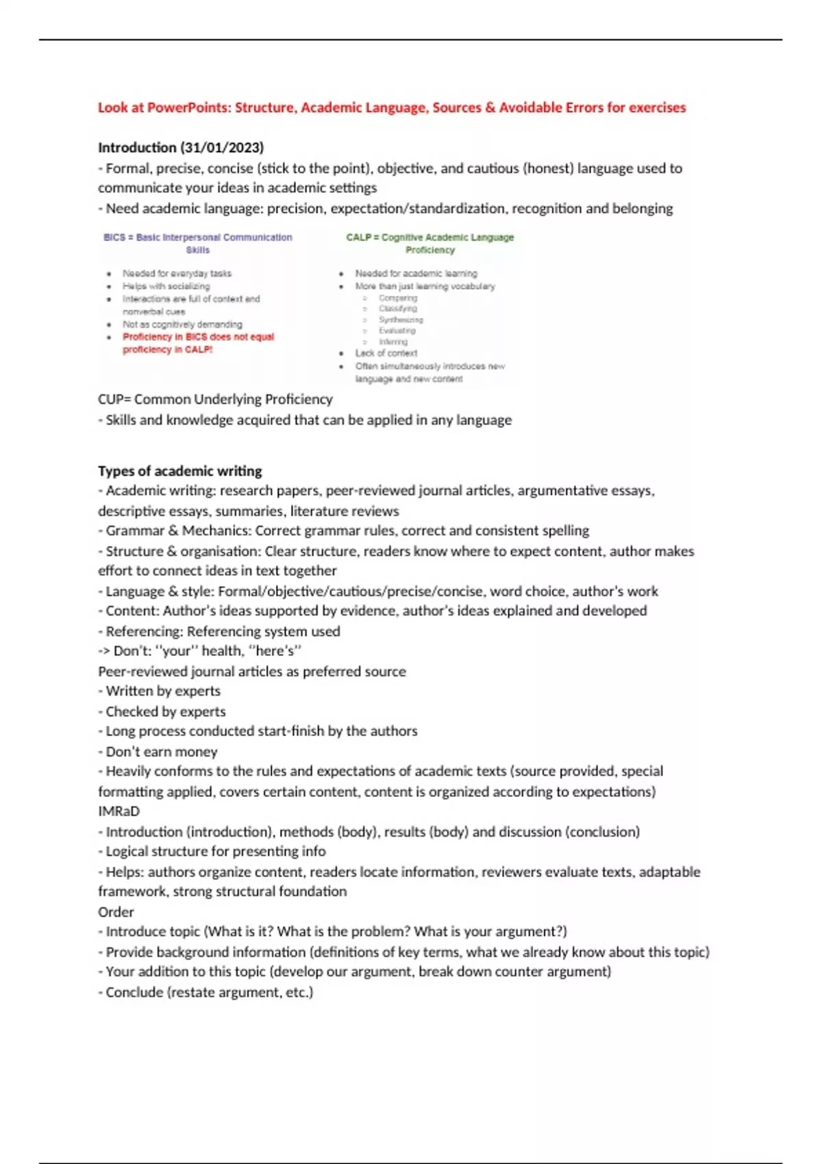 Dit document bevat al het belangrijks uit de colleges van Academic English voor het leren van de midterm.
