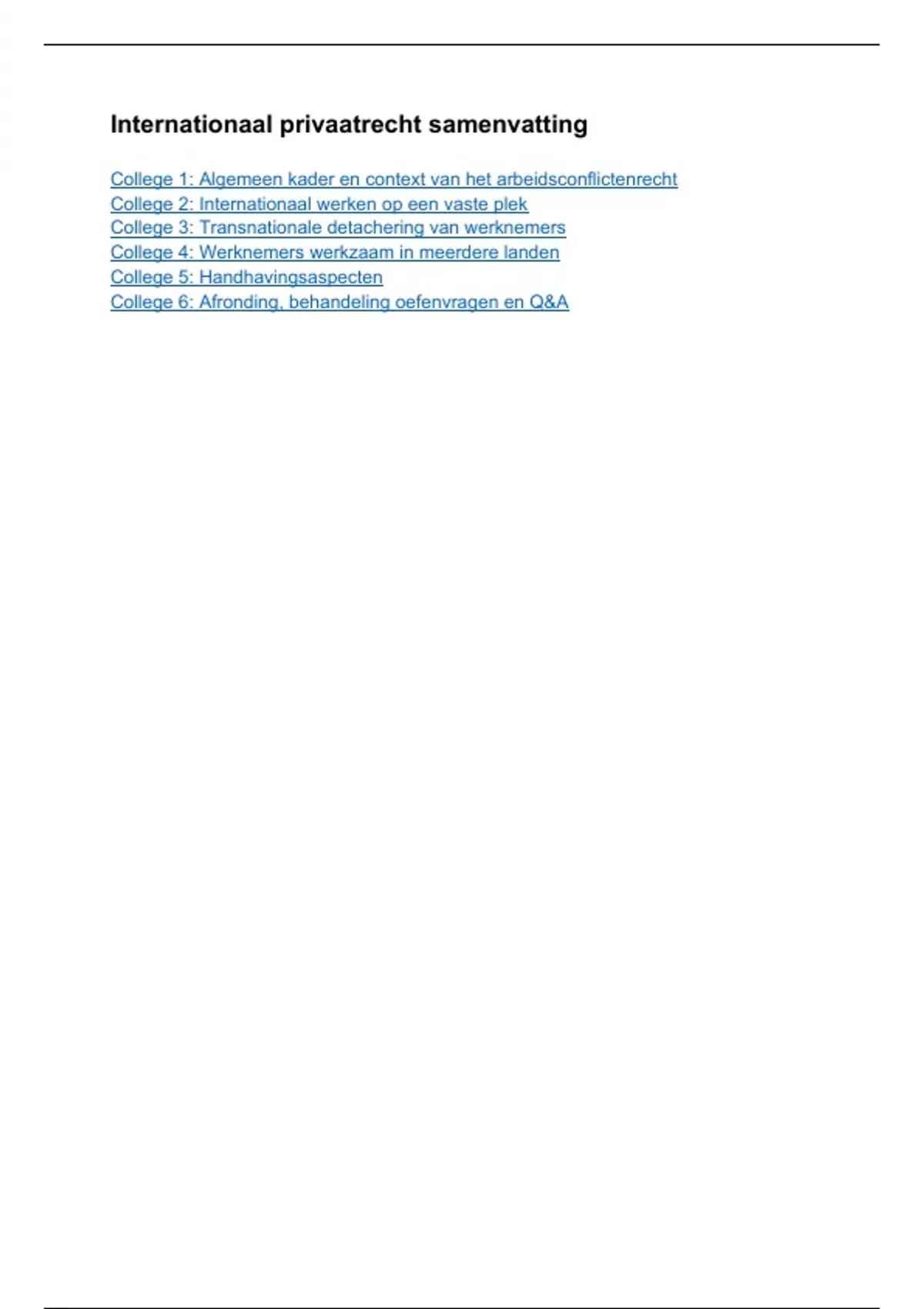 Het document betreft een samenvatting van alle verplichte literatuur van het vak Internationaal Privaatrecht (IPR) en dan meer specifiek het arbeidsrechtelijke gedeelte (Master Rechtsgeleerdheid, Tilburg University). Daarnaast wordt ook de verplichte uitgebreid jurisprudentie besproken. Kortom: alles wat je nodig hebt om het tentamen (ruim) te halen! De navolgende onderwerpen komen aan bod in de samenvatting: College 1: Algemeen kader en context van het arbeidsconflictenrecht College 2: Internationaal werken op een vaste plek College 3: Transnationale detachering van werknemers College 4: Werknemers werkzaam in meerdere landen College 5: Handhavingsaspecten College 6: Afronding, behandeling oefenvragen en Q&A