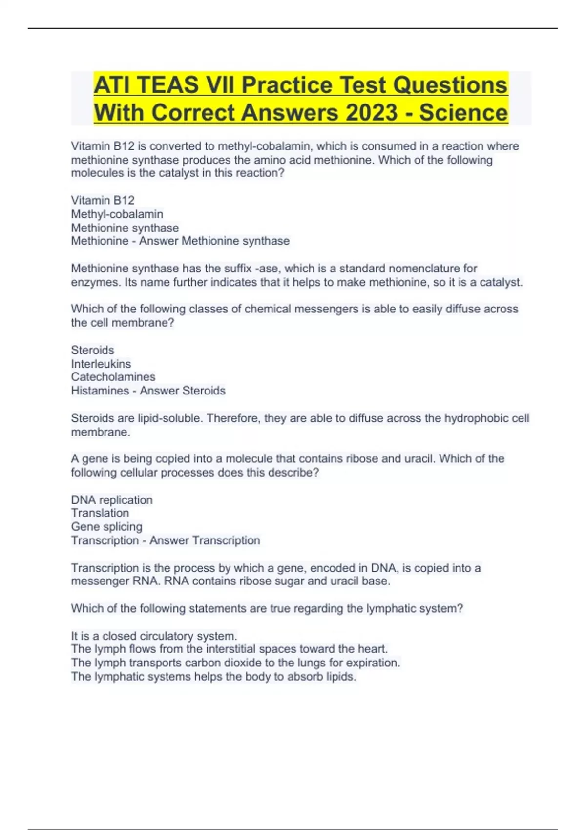 ATI TEAS VII Practice Test Questions With Correct Answers 2023 - Science