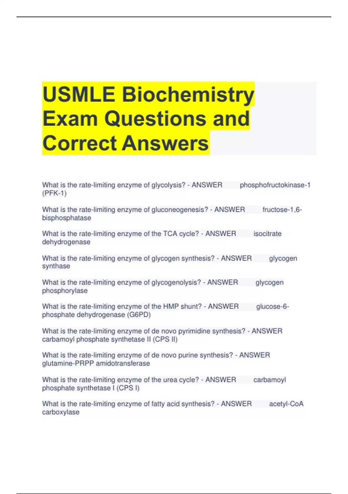 USMLE Biochemistry Exam Questions and Correct Answers What is the rate-limiting enzyme of glycolysis? - ANSWER phosphofructokinase-1 (PFK-1) What is the rate-limiting enzyme of gluconeogenesis? - ANSWER fructose-1,6-bisphosphatase What is the rate-limiting enzyme of the TCA cycle? - ANSWER isocitrate dehydrogenase What is the rate-limiting enzyme of glycogen synthesis? - ANSWER glycogen synthase What is the rate-limiting enzyme of glycogenolysis? - ANSWER glycogen phosphorylase What is the rate-limiting enzyme of the HMP shunt? - ANSWER glucose-6-phosphate dehydrogenase (G6PD) What is the rate-limiting enzyme of de novo pyrimidine synthesis? - ANSWER carbamoyl phosphate synthetase II (CPS II) What is the rate-limiting enzyme of de novo purine synthesis? - ANSWER glutamine-PRPP amidotransferase What is the rate-limiting enzyme of the urea cycle? - ANSWER carbamoyl phosphate synthetase I (CPS I) What is the rate-limiting enzyme of fatty acid synthesis? - ANSWER acetyl-CoA carboxylase