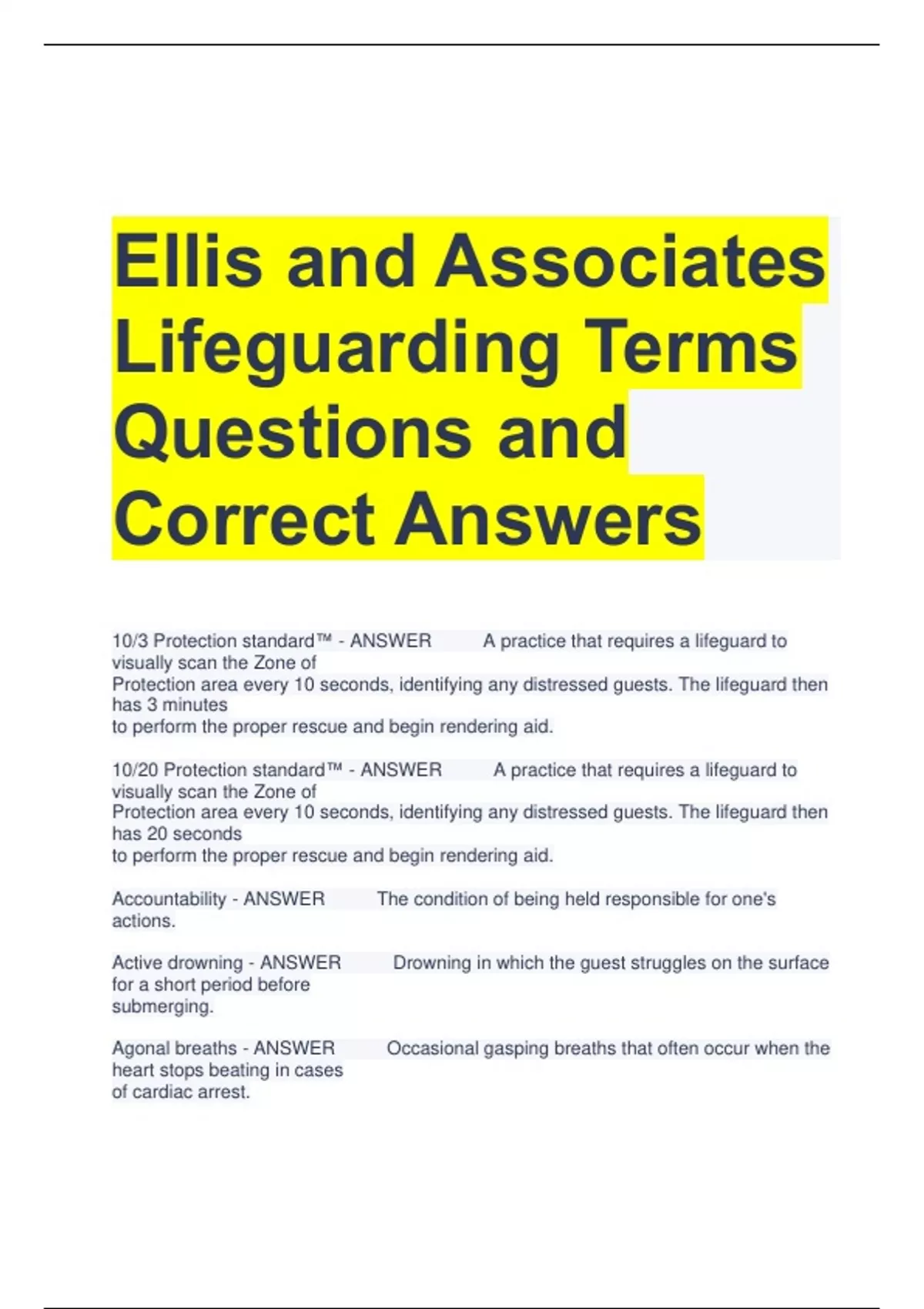 Ellis and Associates Lifeguarding Terms Questions and Correct Answers 10/3 Protection standard™ - ANSWER A practice that requires a lifeguard to visually scan the Zone of Protection area every 10 seconds, identifying any distressed guests. The lifeguard then has 3 minutes to perform the proper rescue and begin rendering aid. 10/20 Protection standard™ - ANSWER A practice that requires a lifeguard to visually scan the Zone of Protection area every 10 seconds, identifying any distressed guests. The lifeguard then has 20 seconds to perform the proper rescue and begin rendering aid. Accountability - ANSWER The condition of being held responsible for one's actions. Active drowning - ANSWER Drowning in which the guest struggles on the surface for a short period before submerging. Agonal breaths - ANSWER Occasional gasping breaths that often occur when the heart stops beating in cases of cardiac arrest. Airway obstruction - ANSWER A blockage of the air passage; choking. Anaphylaxis - ANSWER A severe life-threatening allergic reaction. Approach stroke - ANSWER Any combination of leg kicks and arm movements that allow the lifeguard to make the fastest forward progress in the water. Assist - ANSWER An action of helping a distressed swimmer while being able to maintain the 10/20 Protection standard in the Zone of Protection area. Asthma - ANSWER A medical condition involving the lungs. AED - ANSWER Automated external defibrillator Backboarding - ANSWER A process used by lifeguards to remove a guest with a suspected spinal cord injury from the water without further injury to the spinal column. BVM - ANSWER Bag-valve-mask Bag-valve-mask - ANSWER A device consisting of a face mask attached to a bag with a reservoir and connected to oxygen; it is capable of delivering a high concentration of supplemental oxygen to a nonbreathing guest. Bruise - ANSWER A closed wound of the soft tissue. Cardiac arrest - ANSWER A sudden cessation of heart functioning, meaning it stops pumping blood; verified by absence of a pulse.