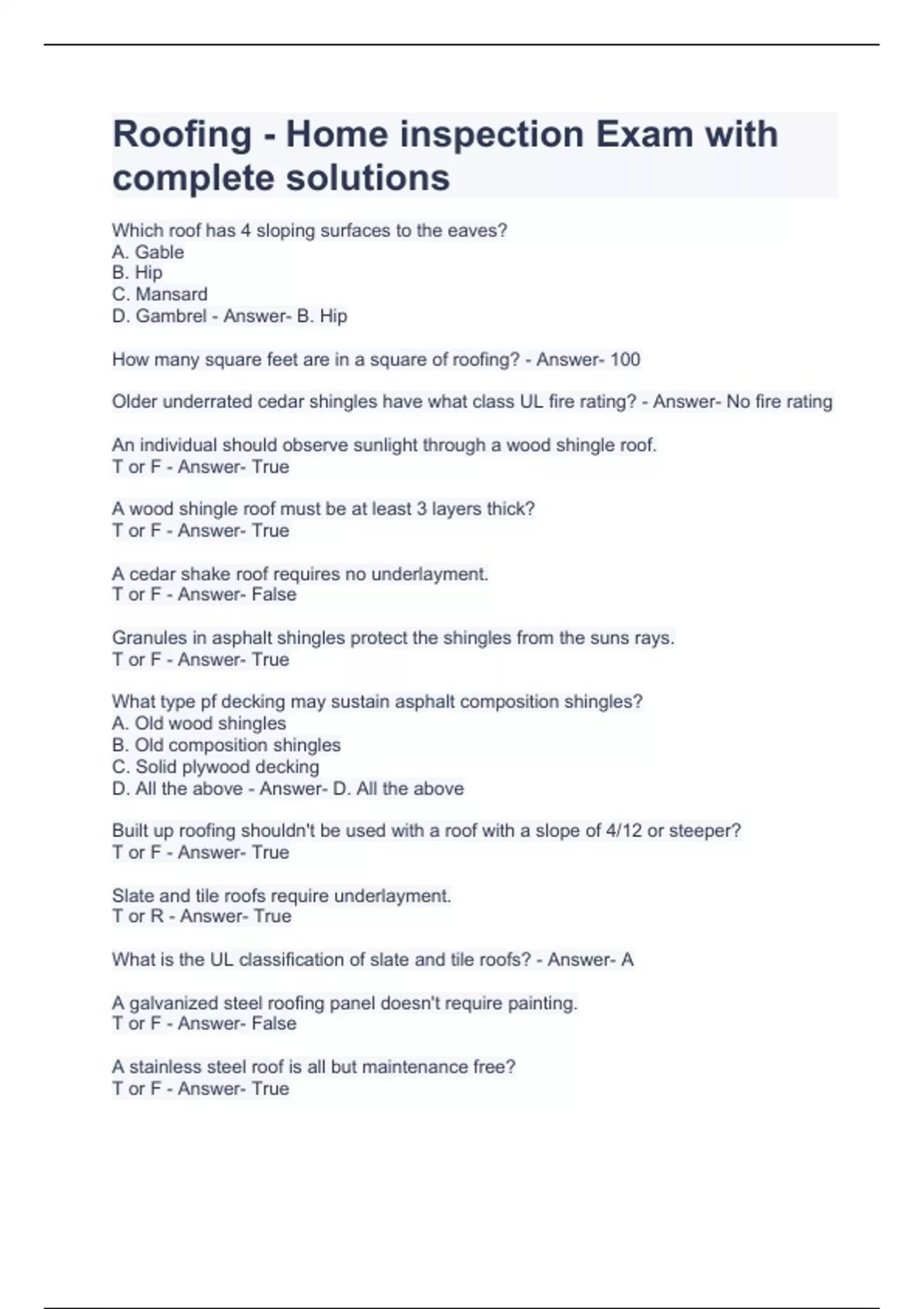 Which roof has 4 sloping surfaces to the eaves? A. Gable B. Hip C. Mansard D. Gambrel - Answer- B. Hip How many square feet are in a square of roofing? - Answer- 100 Older underrated cedar shingles have what class UL fire rating? - Answer- No fire rating An individual should observe sunlight through a wood shingle roof. T or F - Answer- True A wood shingle roof must be at least 3 layers thick? T or F - Answer- True A cedar shake roof requires no underlayment. T or F - Answer- False Granules in asphalt shingles protect the shingles from the suns rays. T or F - Answer- True What type pf decking may sustain asphalt composition shingles? A. Old wood shingles B. Old composition shingles C. Solid plywood decking D. All the above - Answer- D. All the above Built up roofing shouldn't be used with a roof with a slope of 4/12 or steeper? T or F - Answer- True Slate and tile roofs require underlayment. T or R - Answer- True What is the UL classification of slate and tile roofs? - Answer- A A galvanized steel roofing panel doesn't require painting. T or F - Answer- False A stainless steel roof is all but maintenance free? T or F - Answer- True