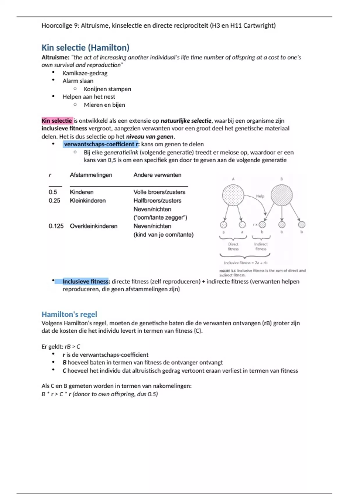 Hoorcollge 9: Altruisme, kinselectie en directe reciprociteit (H3 en H11 Cartwright)