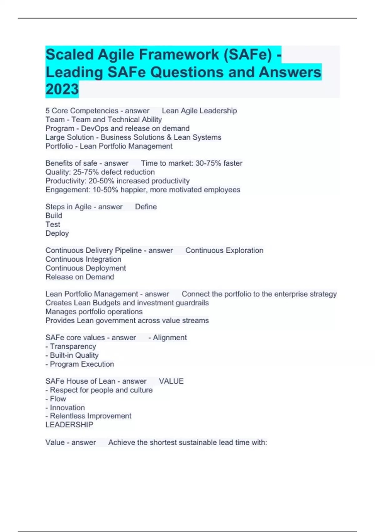Scaled Agile Framework (SAFe) - Leading SAFe Questions and Answers 2023 5 Core Competencies Lean Agile Leadership Team - Team and Technical Ability Program - DevOps and release on demand Large Solution - Business Solutions & Lean Systems Portfolio - Lean Portfolio Management Benefits of safe Time to market: 30-75% faster Quality: 25-75% defect reduction Productivity: 20-50% increased productivity Engagement: 10-50% happier, more motivated employees Steps in Agile Define Build Test Deploy Continuous Delivery Pipeline Continuous Exploration Continuous Integration Continuous Deployment Release on Demand Lean Portfolio Management Connect the portfolio to the enterprise strategy Creates Lean Budgets and investment guardrails Manages portfolio operations Provides Lean government across value streams SAFe core values - Alignment - Transparency - Built-in Quality - Program Execution SAFe House of Lean VALUE - Respect for people and culture - Flow - Innovation - Relentless Improvement LEADERSHIP Value Achieve the shortest sustainable lead time with: - best quality and value to people and society - high morale, safety, and customer delight Respect for People and Culture - people do the work - your customer is whoever consumes your work - build long term partnerships based on trust - cultural change comes last, not first - to change the culture, you have to change the organization Flow - Optimize continuous and sustainable throughput of value - avoid start-stop-start project delays - Build quality in - Understand, exploit, and manage variability - Integrate frequently - Informed decision-making via fast feedback Innovation - Producers innovate, customers validate - Get out of the office (Gemba: walk around) - Provide time and space for creativity - Pivot without mercy of guilt Relentless Improvement - A constant sense of danger - Optimize the whole - Consider facts carefully, then act quickly - Apply lean tools to identify and address root causes - Reflect at key milestones; identify and address shortcomings Leadership - Lead the change - Know the way; emphasize life long learning - Develop people - Inspire and align with mission; minimize constraints - Decentralize decision-making - Unlock the intrinsic motivation of knowledge workers Agile Manifesto (4 key points) 1. Individuals and interactions over processes and tools 2. Working software over comprehensive documentation 3. Customer collaboration over contract negotiation 4. Responding to change over following a plan 12 Principles of Agile Manifesto (1-6) 1. Our highest priority is to satisfy the customer through early and continuous delivery of software. 2. Welcome changing requirements, even late in development. Agile processes harness change for the customer's competitive advantage. 3. Deliver working software frequently, from a couple of weeks to a couple of months, with a preference on shorter. 4. Business people and developers must work together daily throughout the project. 5. Build projects around motivated individuals. Give them the environment and support they need and trust them to get the job done. 6. The most efficient and effective method of conveying information to and within a development team is face-to-face conversation. 12 Principles of Agile Manifesto (6-12) 7. Working software is the primary measure of progress. 8. Agile processes promote sustainable development. The sponsors, developers and users should be able to maintain a constant pace. 9. Continuous attention to technical excellence and good design enhances agility. 10. Simplicity - the art of maximizing the amount of work not done, is essential. 11. The best architectures, requirements and designs emerge from self-organizing teams. 12. At regular intervals, the team reflects on how to become more effective, then tunes and adjusts its behavior accordingly.