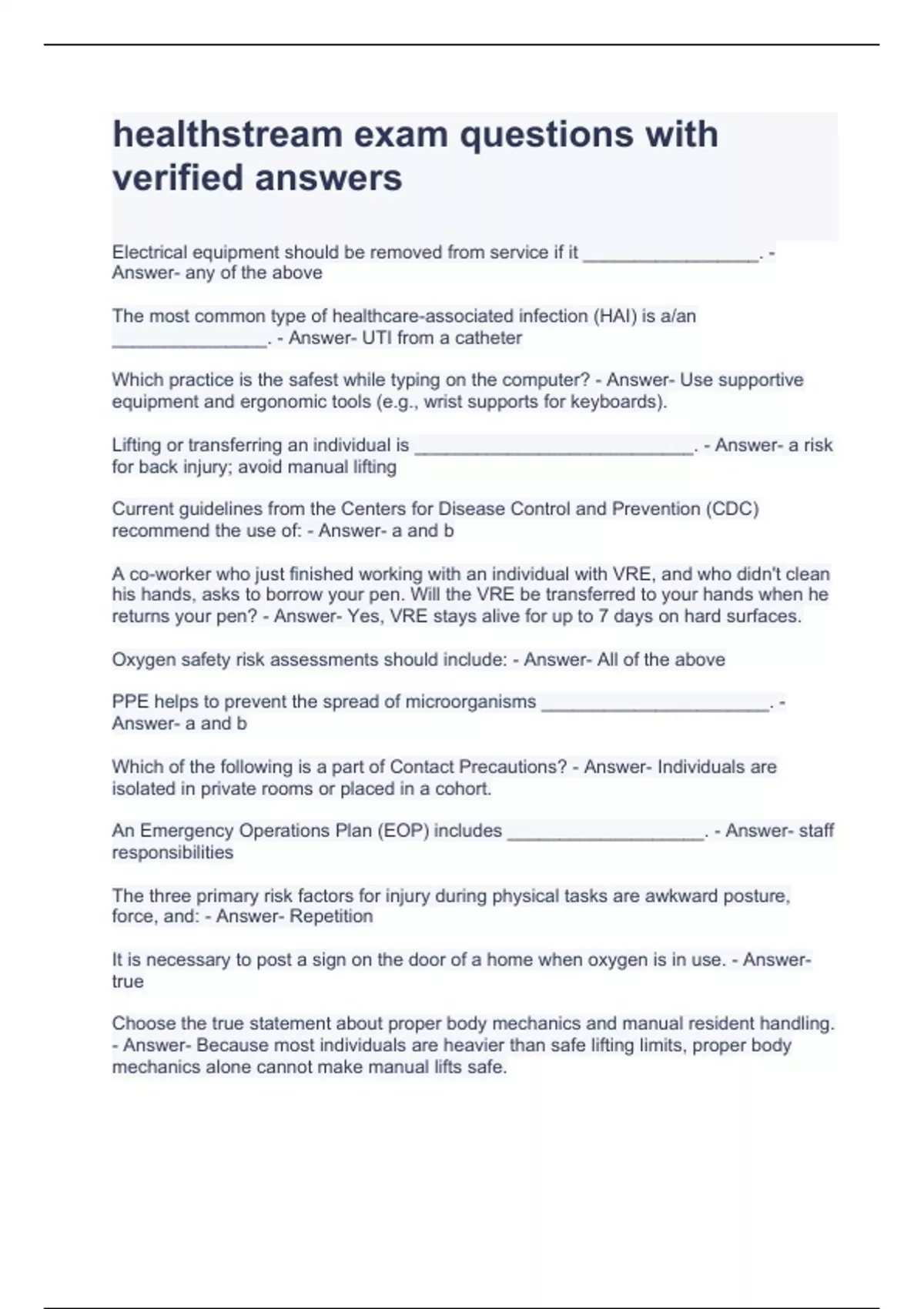 Electrical equipment should be removed from service if it _________________. - Answer- any of the above The most common type of healthcare-associated infection (HAI) is a/an _______________. - Answer- UTI from a catheter Which practice is the safest while typing on the computer? - Answer- Use supportive equipment and ergonomic tools (e.g., wrist supports for keyboards). Lifting or transferring an individual is ___________________________. - Answer- a risk for back injury; avoid manual lifting Current guidelines from the Centers for Disease Control and Prevention (CDC) recommend the use of: - Answer- a and b A co-worker who just finished working with an individual with VRE, and who didn't clean his hands, asks to borrow your pen. Will the VRE be transferred to your hands when he returns your pen? - Answer- Yes, VRE stays alive for up to 7 days on hard surfaces. Oxygen safety risk assessments should include: - Answer- All of the above PPE helps to prevent the spread of microorganisms ______________________. - Answer- a and b Which of the following is a part of Contact Precautions? - Answer- Individuals are isolated in private rooms or placed in a cohort. An Emergency Operations Plan (EOP) includes ___________________. - Answer- staff responsibilities The three primary risk factors for injury during physical tasks are awkward posture, force, and: - Answer- Repetition It is necessary to post a sign on the door of a home when oxygen is in use. - Answer- true Choose the true statement about proper body mechanics and manual resident handling. - Answer- Because most individuals are heavier than safe lifting limits, proper body mechanics alone cannot make manual lifts safe. Disasters are events that may ______________________. - Answer- Both a and b The CDC and healthcare accrediting organizations expect facilities to implement practices to prevent healthcare-associated infections (HAI). One important practice is _________________. - Answer- proper hand hygiene On wet floors, the safest way to walk is to _____________. - Answer- make wide turns at corners Employees who work with hazardous chemicals must ________________________. - Answer- All of the above ____________ have hazard communication duties. - Answer- Manufacturers, employers, and employees To keep a strong, healthy back, engage in a program including ______________________. - Answer- All of the above Which of the following medical conditions is most likely to be relevant during an individual's pre-transfer assessment? - Answer- Obesity What is a good strategy for helping to prevent the spread of antibiotic resistance? - Answer- All of the above Latex allergies are more common in people who _________________. - Answer- have food allergies What is a safety data sheet (SDS)? - Answer- A document that lists the specific hazards of a chemical If confronted with violence in a home setting, ____________. - Answer- All of the above The R in RACE stands for _________________. - Answer- Remove or Rescue The fire-extinguisher protocol PASS stands for: - Answer- Pull, Aim, Squeeze, Sweep When assessing an individual for a lift or transfer, a factor to consider is: - Answer- The individual's ability to bear weight and assist in the t