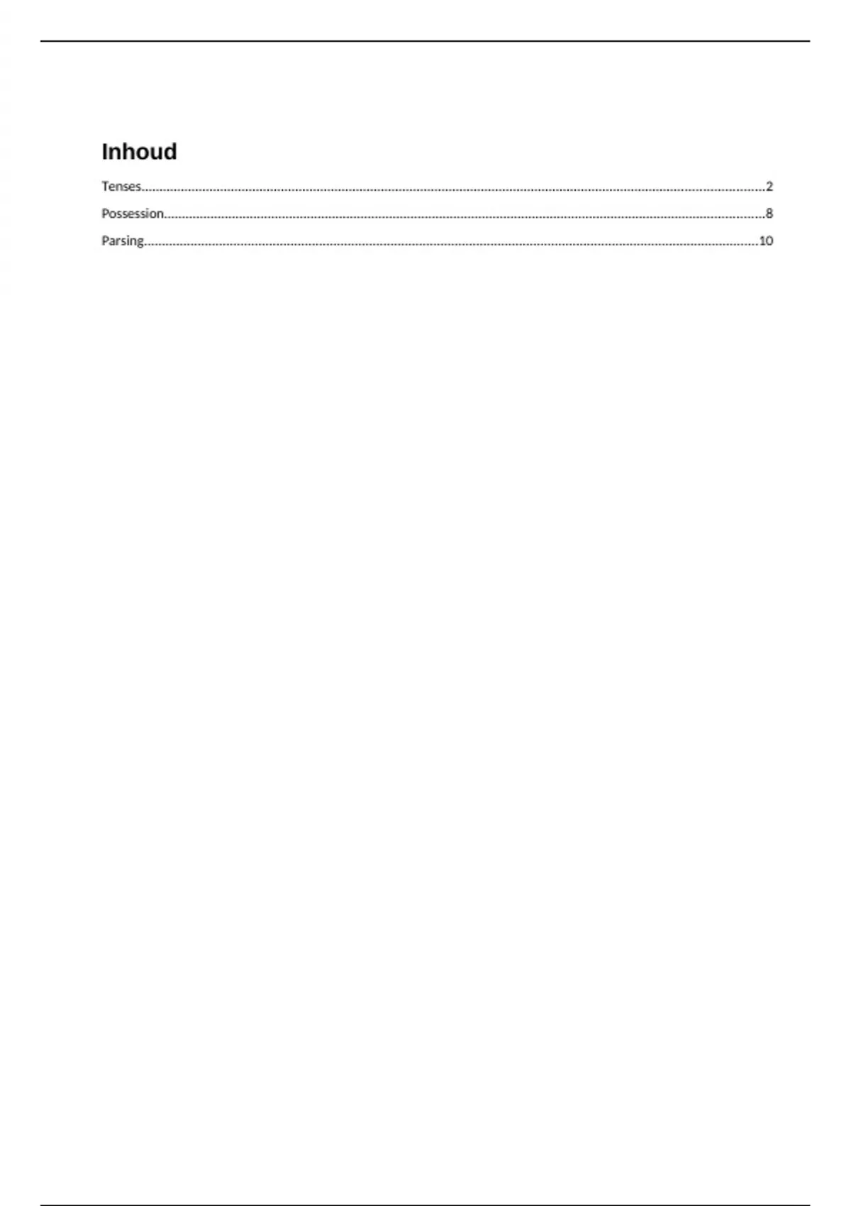 Dit document bevat uitleg over de Tenses, Possessives en Parsing in het Engels. Dit is de basis informatie van de Engelse Grammatica en bevat voorbeelden om mee te oefenen. Dit document bevat soms wat spel of interpunctie fouten, dit komt omdat dit aan het begin van mijn studie is geschreven. Deze spelfouten zijn niet zodanig hinderend voor het begrip en onderwerp, het lijkt echter soms iets wat slordig.
