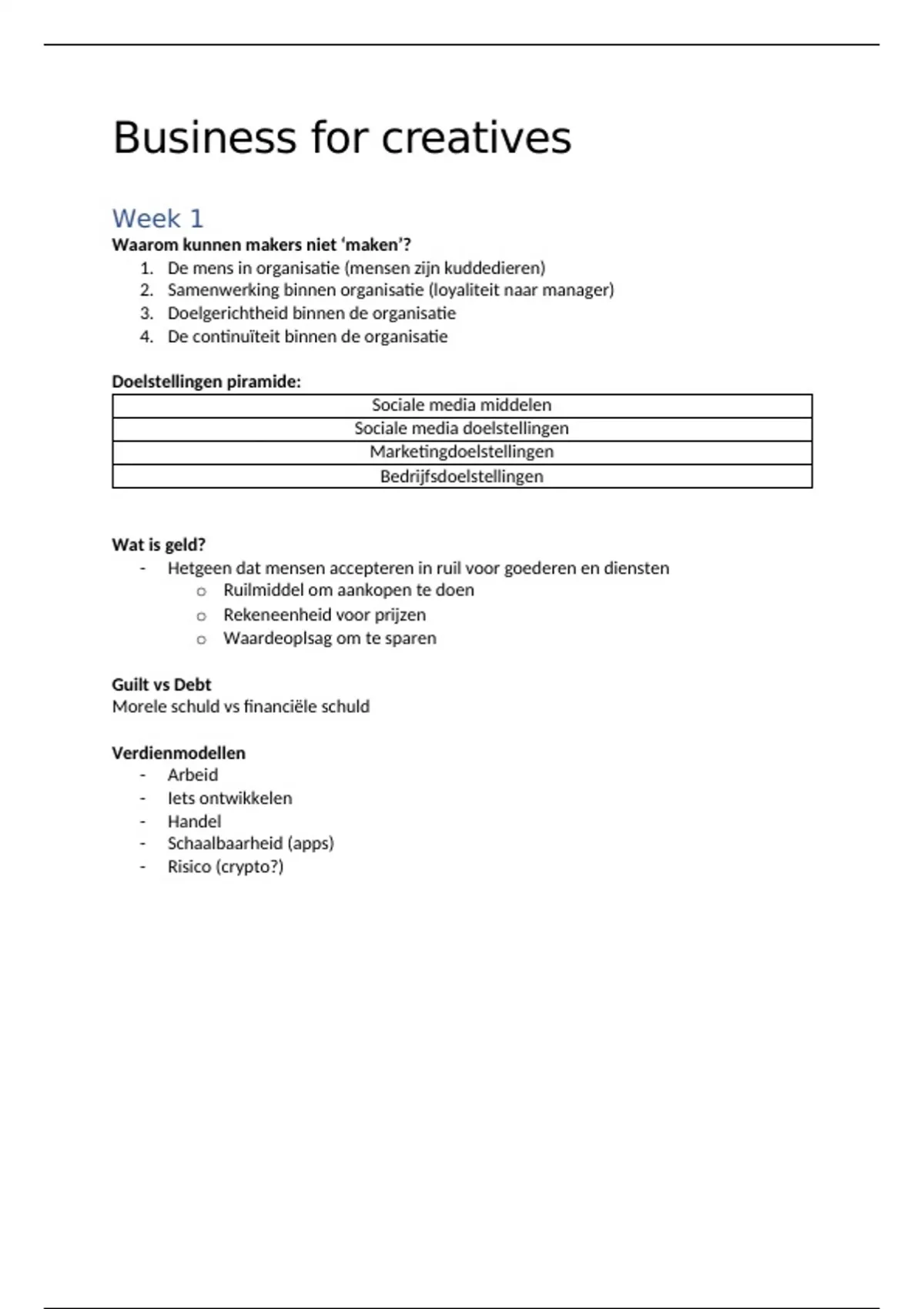 Collegedictaat van 18 pagina's voor het vak Business for Creatives aan de Saxion (Sterkte!)