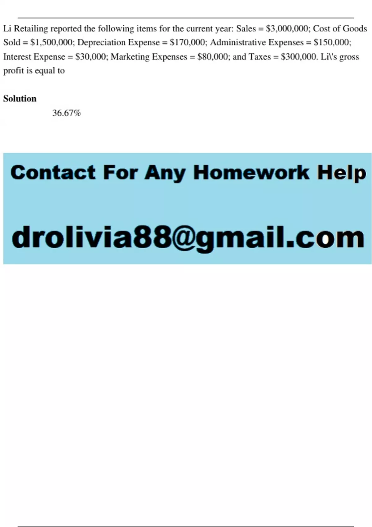 Li Retailing reported the following items for the current year: Sales = $3,000,000; Cost of Goods Sold = $1,500,000; Depreciation Expense = $170,000; Administrative Expenses = $150,000; Interest Expense = $30,000; Marketing Expenses = $80,000; and Taxes = $300,000. Li's gross profit is equal to Solution 36.67%