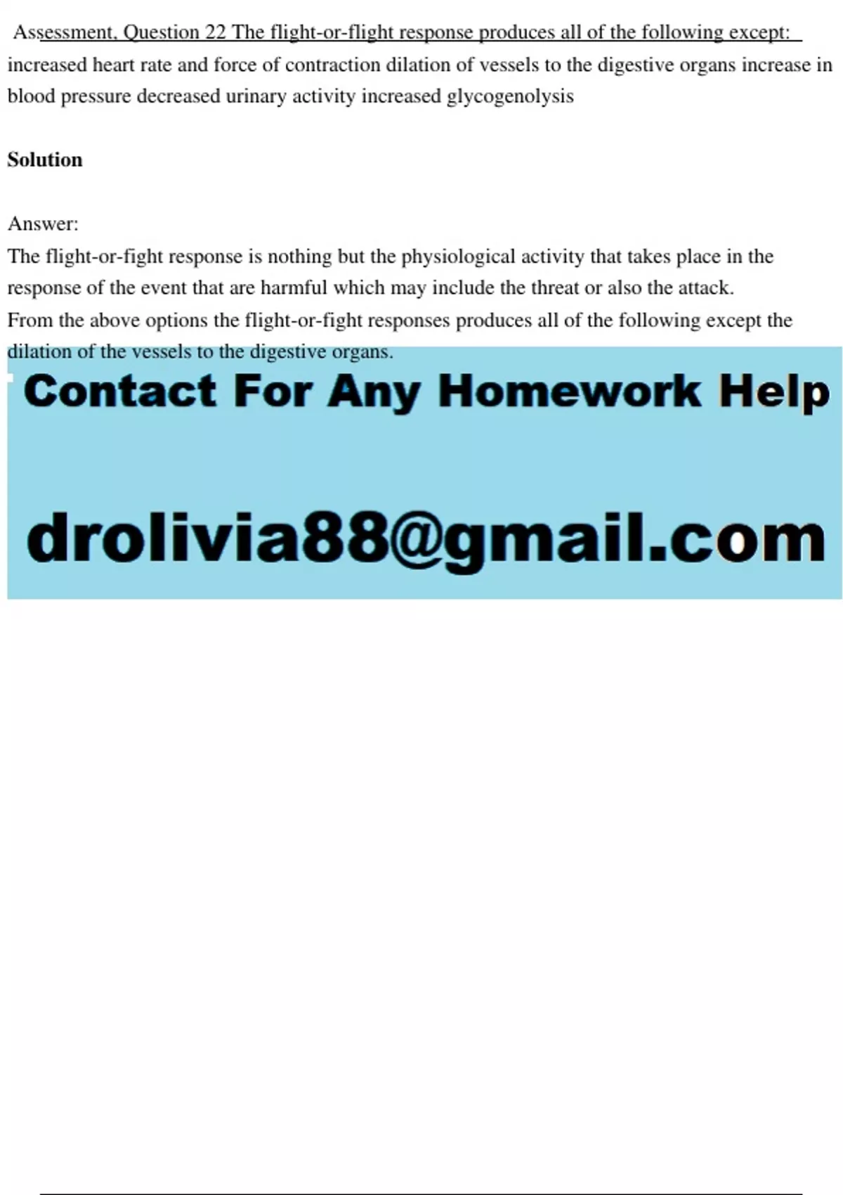 Assessment, Question 22 The flight-or-flight response produces all of the following except: increased heart rate and force of contraction dilation of vessels to the digestive organs increase in blood pressure decreased urinary activity increased glycogenolysis Solution Answer: The flight-or-fight response is nothing but the physiological activity that takes place in the response of the event that are harmful which may include the threat or also the attack. From the above options the flight-or-fight responses produces all of the following except the dilation of the vessels to the digestive organs.