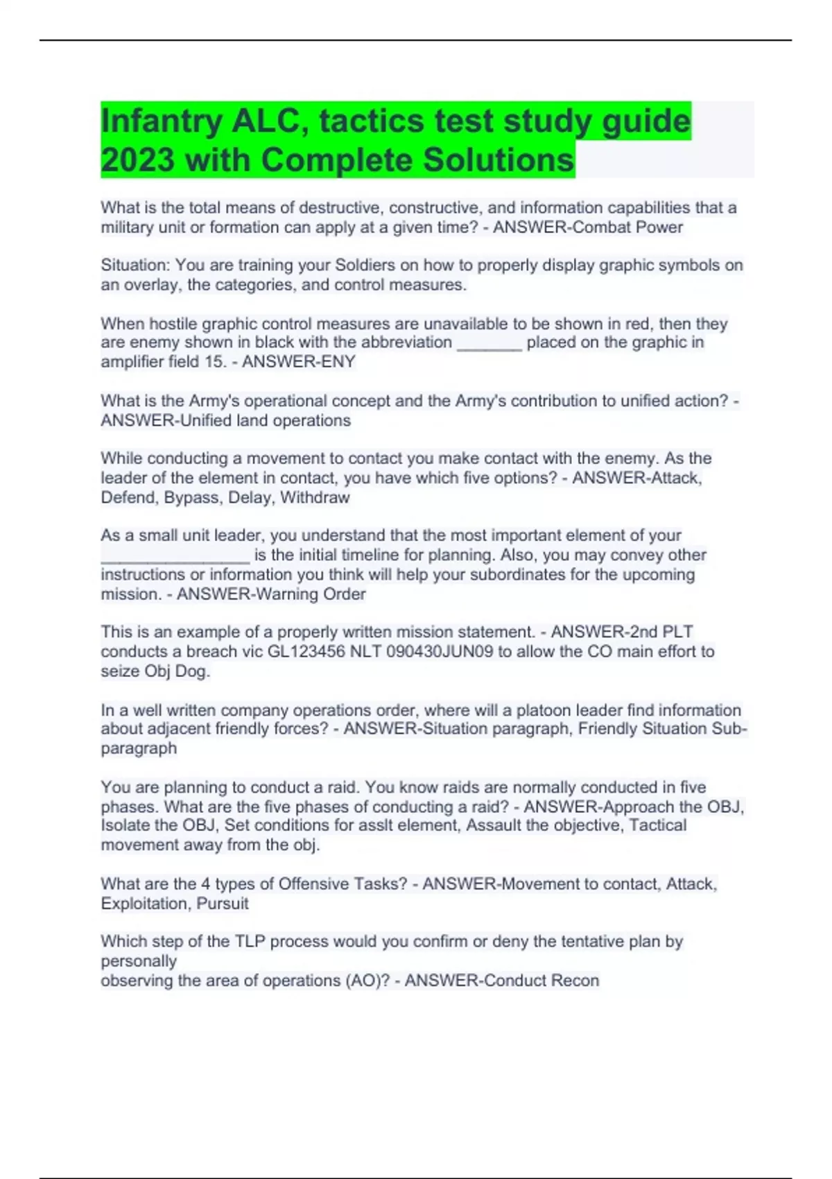 Infantry ALC, tactics test study guide 2023 with Complete Solutions