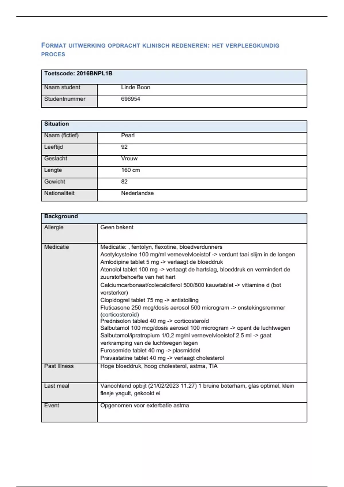 FORMAT UITWERKING OPDRACHT KLINISCH REDENEREN: HET VERPLEEGKUNDIG