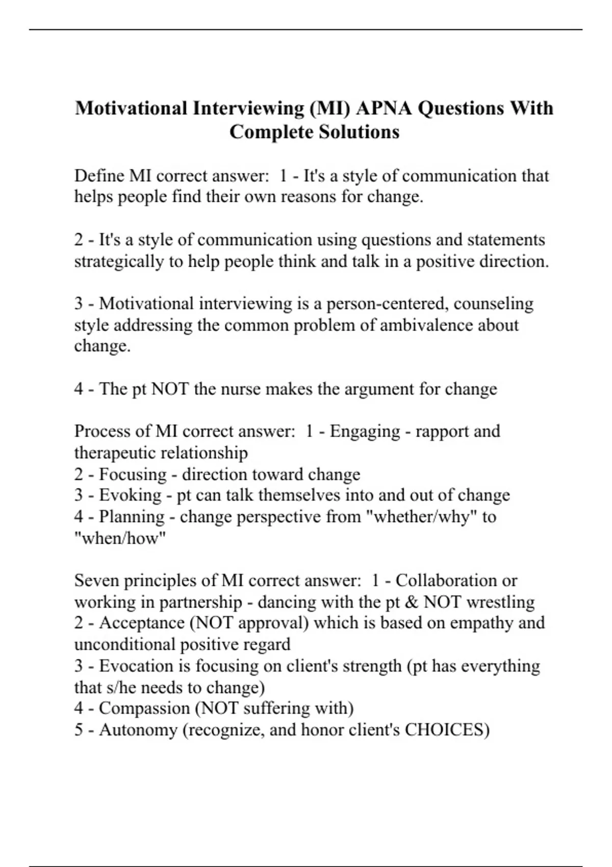 Motivational Interviewing (MI) APNA Questions With Complete Solutions