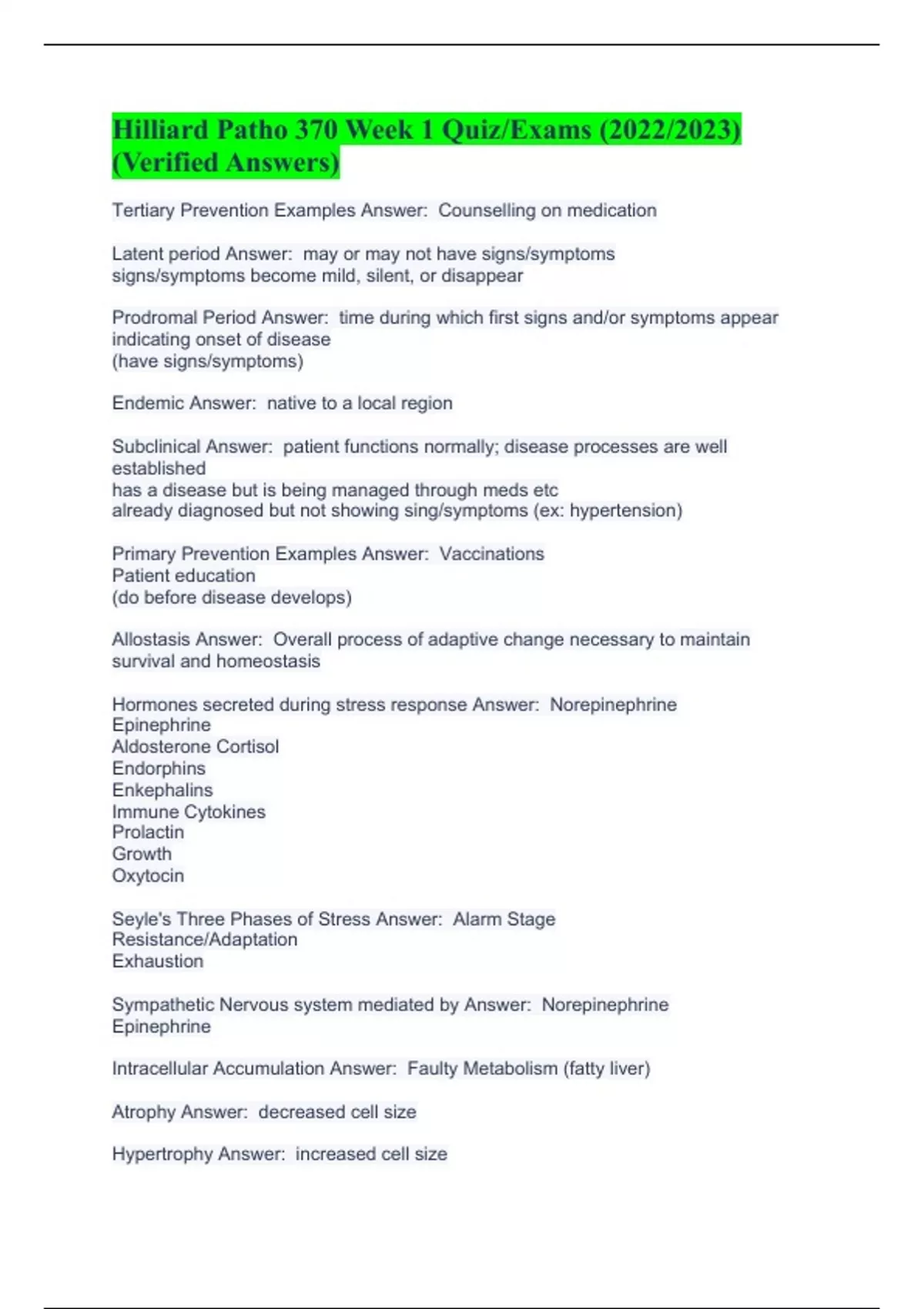 Hilliard Patho 370 Week 1 Quiz/Exams (2022/2023) (Verified Answers) Tertiary Prevention Examples Answer: Counselling on medication Latent period Answer: may or may not have signs/symptoms signs/symptoms become mild, silent, or disappear Prodromal Period Answer: time during which first signs and/or symptoms appear indicating onset of disease (have signs/symptoms) Endemic Answer: native to a local region Subclinical Answer: patient functions normally; disease processes are well established has a disease but is being managed through meds etc already diagnosed but not showing sing/symptoms (ex: hypertension) Primary Prevention Examples Answer: Vaccinations Patient education (do before disease develops) Allostasis Answer: Overall process of adaptive change necessary to maintain survival and homeostasis Hormones secreted during stress response Answer: Norepinephrine Epinephrine Aldosterone Cortisol Endorphins Enkephalins Immune Cytokines Prolactin Growth Oxytocin Seyle's Three Phases of Stress Answer: Alarm Stage Resistance/Adaptation Exhaustion Sympathetic Nervous system mediated by Answer: Norepinephrine Epinephrine Intracellular Accumulation Answer: Faulty Metabolism (fatty liver) Atrophy Answer: decreased cell size Hypertrophy Answer: increased cell size Hyperplasia Answer: increased cell number Metaplasia Answer: conversion of one cell type to another Dysplasia Answer: disorderly growth Coagulative Necrosis Answer: begins with ischemia ends with degradation of plasma membrane black and dry Liquefactive Answer: occurs with dissolution of dead cells formation of abscess or cyst from dissolves dead tissue