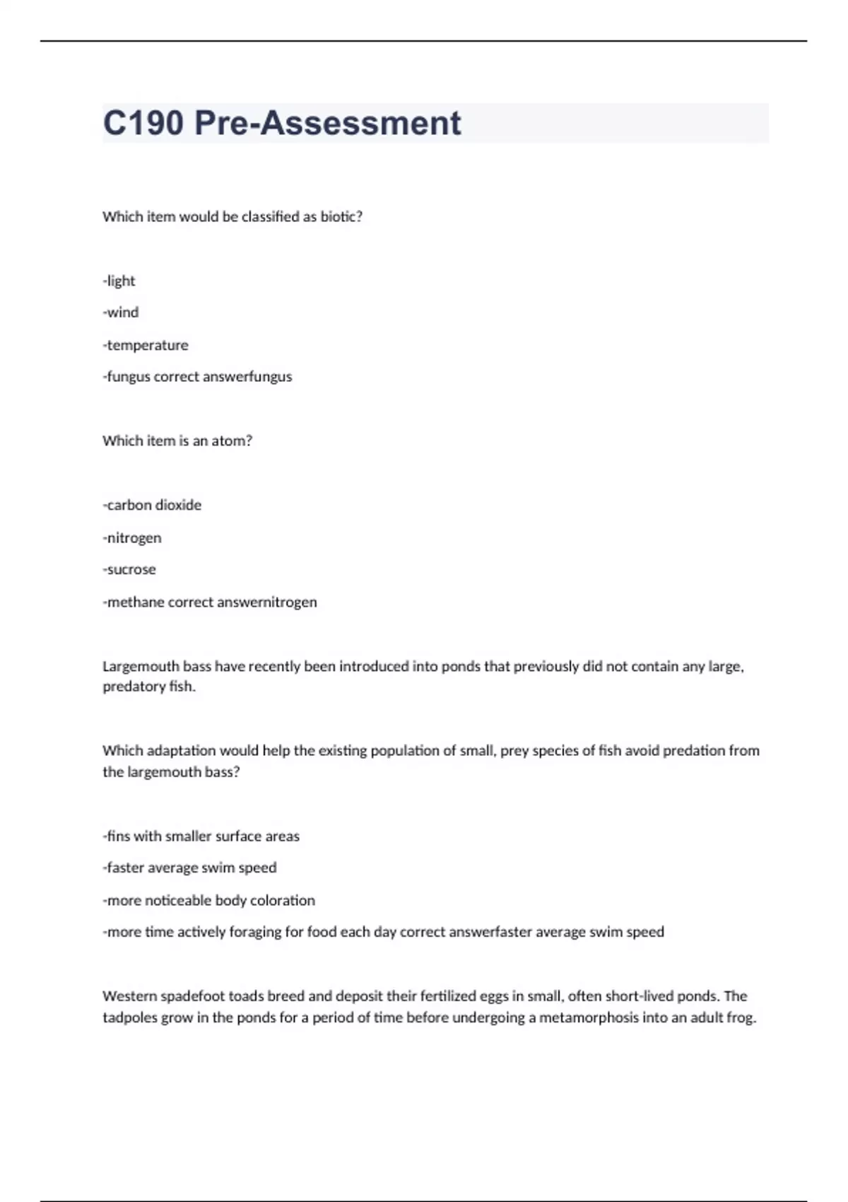 Which item would be classified as biotic? -light -wind -temperature -fungus fungus Which item is an atom? -carbon dioxide -nitrogen -sucrose -methane nitrogen Largemouth bass have recently been introduced into ponds that previously did not contain any large, predatory fish. Which adaptation would help the existing population of small, prey species of fish avoid predation from the largemouth bass? -fins with smaller surface areas -faster average swim speed -more noticeable body coloration -more time actively foraging for food each day faster average swim speed Western spadefoot toads breed and deposit their fertilized eggs in small, often short-lived ponds. The tadpoles grow in the ponds for a period of time before undergoing a metamorphosis into an adult frog. One unusual characteristic of spadefoot tadpoles is the ability to change body form during development. Normally most tadpoles are herbivorous and feed on plant material. However, when conditions in the ponds suggest they are beginning to dry up (e.g., an increase in water temperature or concentration of organic waste), a small percentage of individuals in the population undergo a dramatic change in body form and habit and begin to eat their competitors. This ability is considered to be advantageous as it both reduces the number of competitors in the pond and speeds up the rate of development of the transformed tadpoles. If global climate change continues (as predicted) to increase the average temperature of habitats around the world, how would populations of spadefoot toads likely evolve in response to an increase in pond temperatures? -Spadefoot toads would likely evolve to lay fewer eggs to try and offset the increase in the mortality rate. -Spadefoot toads would likely evolve to increase the period of tadpole development. -Spadefoot toads would likely evolve to have a higher percentage of tadpoles be herbivorous. -Spadefoot toads would likely evolve to have a higher percentage of toads become carnivorous. Spadefoot toads would likely evolve to have a higher percentage of toads become carnivorous.
