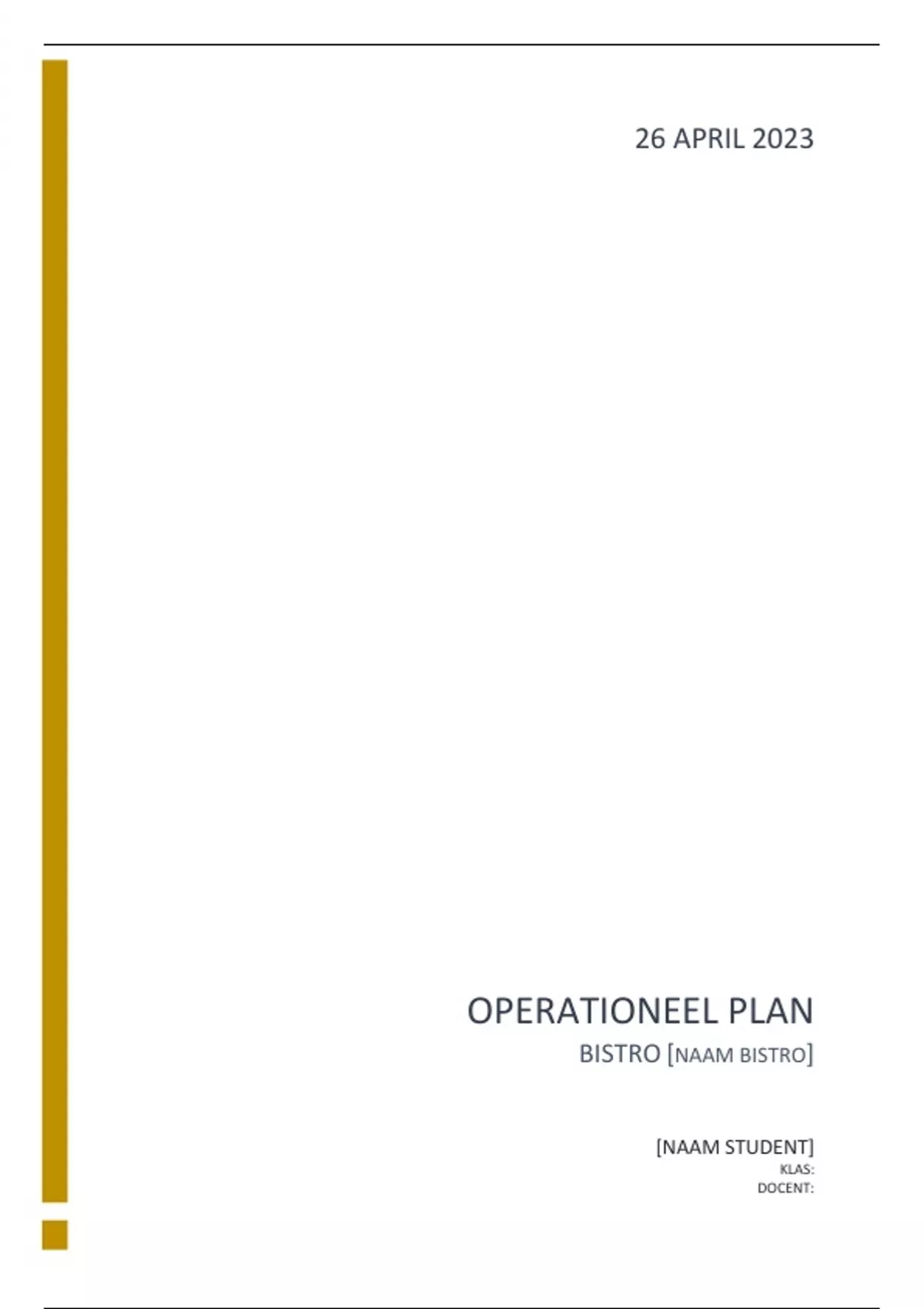 Operationeel Plan 2023 | Manager/Ondernemer Horeca | Rijn IJssel Vakschool Wageningen. Ik heb dit operationeel plan in 1x afgerond met een GOED (cijfer 9,0!). Ik heb de opleiding Manager/Ondernemer Horeca gevolgd aan Rijn IJssel Vakschool Wageningen. Het operationeel plan is gebaseerd op een klassieke Franse bistro. Het plan bevat ook alle financiële aspecten en begrotingen. Privacygevoelige informatie is uit het plan verwijderd of onherkenbaar gemaakt. Hier mag je dus je eigen invulling aan geven. Let op! Rijn IJssel Vakschool Wageningen heeft een database waarin alle operationele plannen van de afgelopen jaren worden opgeslagen. Dit operationeel plan volledig overnemen kan PLAGIAAT opleveren. Gebruik dit operationeel plan dus alleen als voorbeeld! :-) Wil je graag het bijpassende ondernemingsplan? Deze staat óók op mijn pagina TE KOOP. De bronnenlijst is uit dit plan verwijderd. Voor de bronnenlijst kan je mij een pb sturen.
