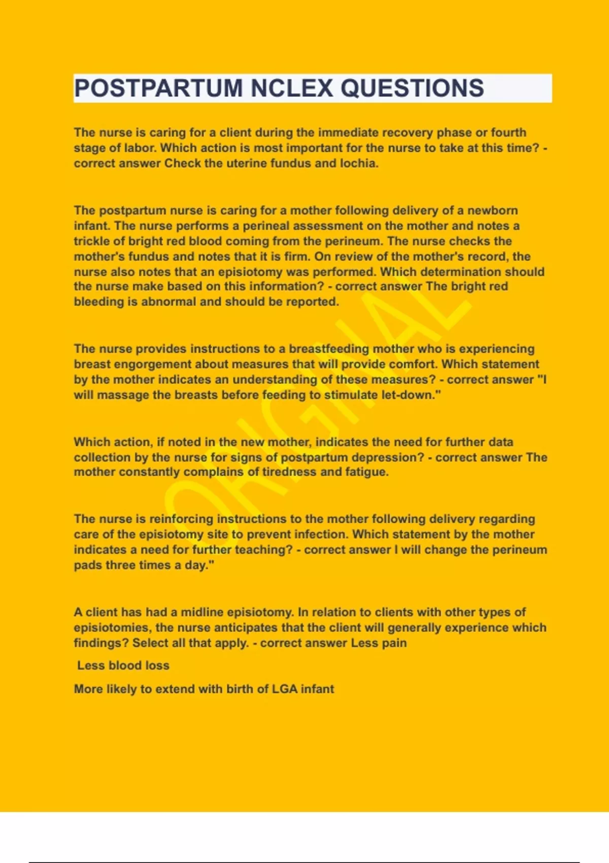 POSTPARTUM NCLEX QUESTIONS|UPDATED&VERIFIED|GUARANTEED SUCCESS