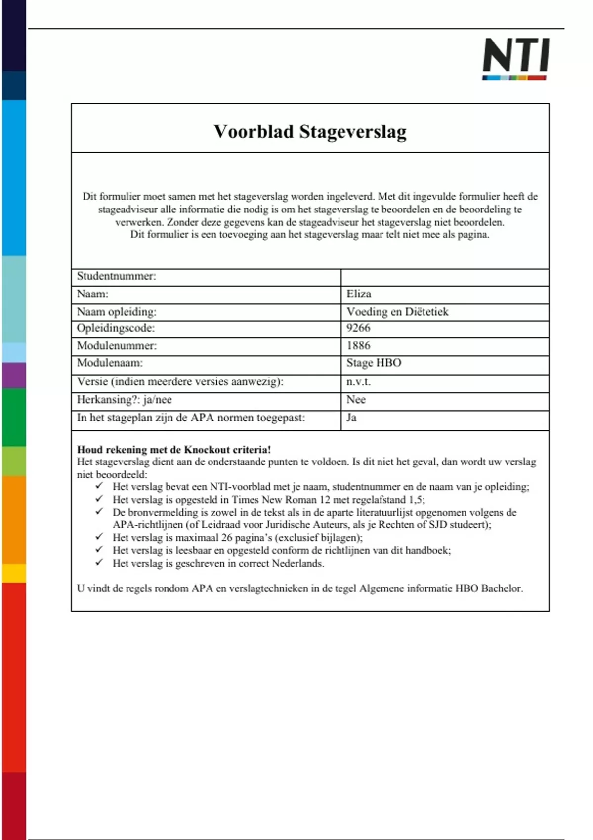 ü Het verslag bevat een NTI-voorblad met je naam, studentnummer en de naam van je opleiding;