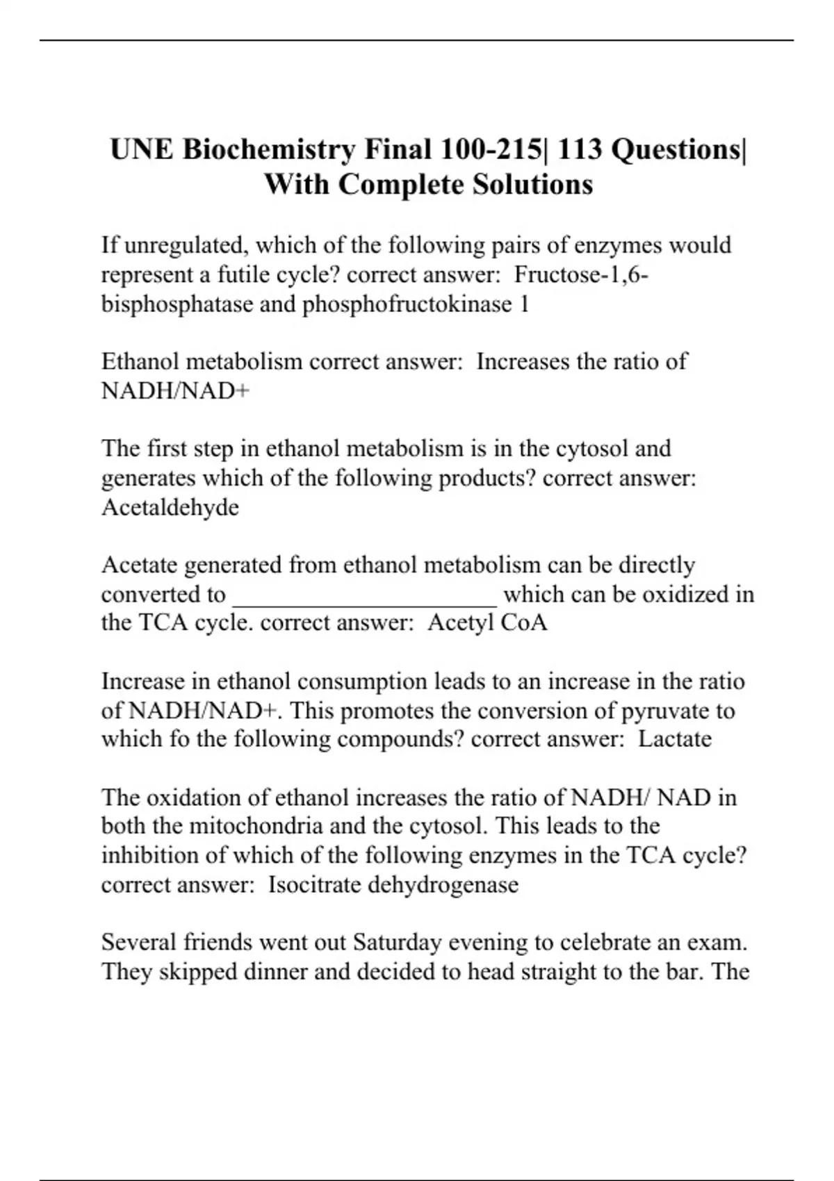 UNE Biochemistry Final 100-215| 113 Questions| With Complete Solutions