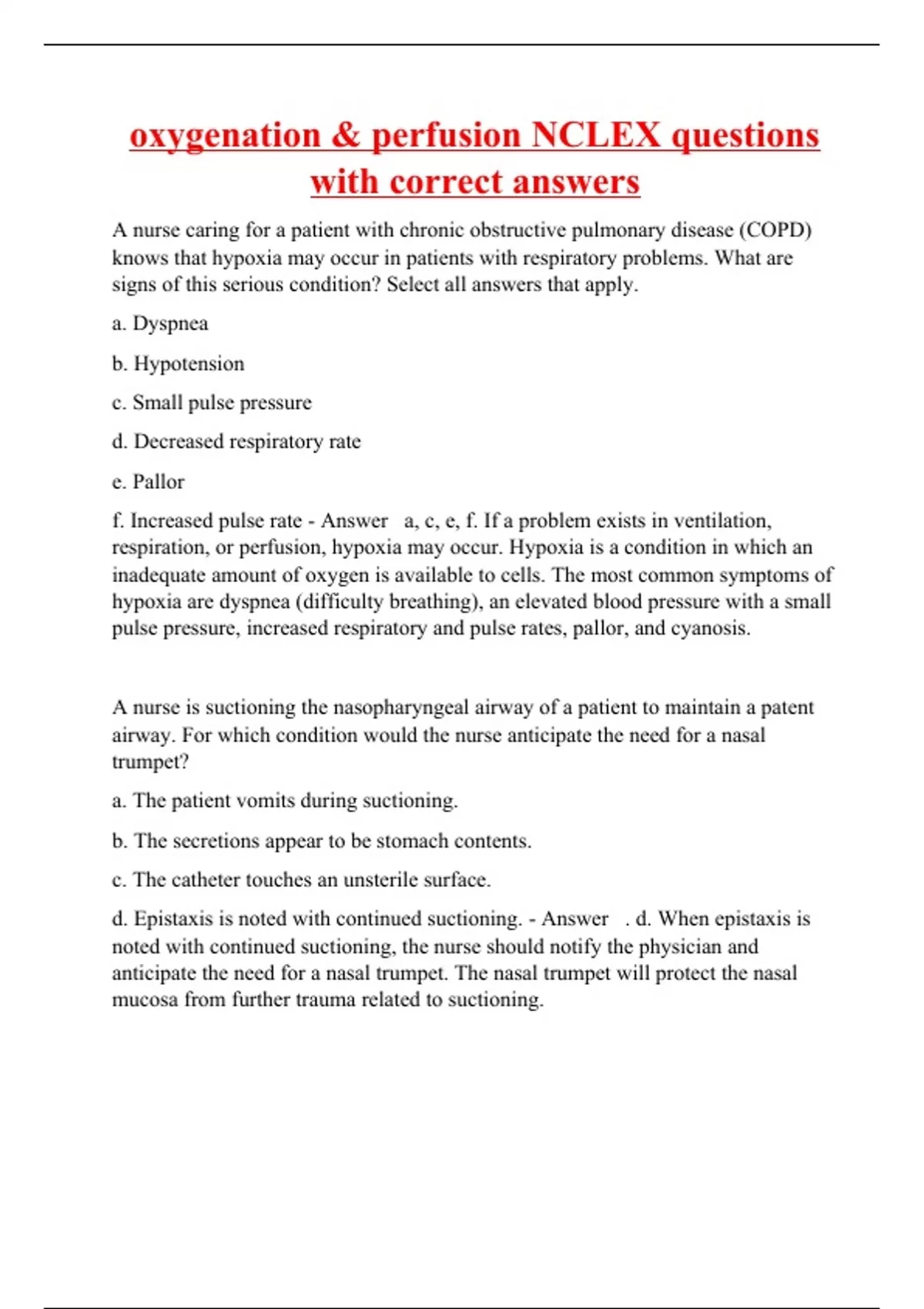 A nurse caring for a patient with chronic obstructive pulmonary disease (COPD) knows that hypoxia may occur in patients with respiratory problems. What are signs of this serious condition? Select all answers that apply. a. Dyspnea b. Hypotension c. Small pulse pressure d. Decreased respiratory rate e. Pallor f. Increased pulse rate - Answer a, c, e, f. If a problem exists in ventilation, respiration, or perfusion, hypoxia may occur. Hypoxia is a condition in which an inadequate amount of oxygen is available to cells. The most common symptoms of hypoxia are dyspnea (difficulty breathing), an elevated blood pressure with a small pulse pressure, increased respiratory and pulse rates, pallor, and cyanosis. A nurse is suctioning the nasopharyngeal airway of a patient to maintain a patent airway. For which condition would the nurse anticipate the need for a nasal trumpet? a. The patient vomits during suctioning. b. The secretions appear to be stomach contents. c. The catheter touches an unsterile surface. d. Epistaxis is noted with continued suctioning. - Answer . d. When epistaxis is noted with continued suctioning, the nurse should notify the physician and anticipate the need for a nasal trumpet. The nasal trumpet will protect the nasal mucosa from further trauma related to suctioning.