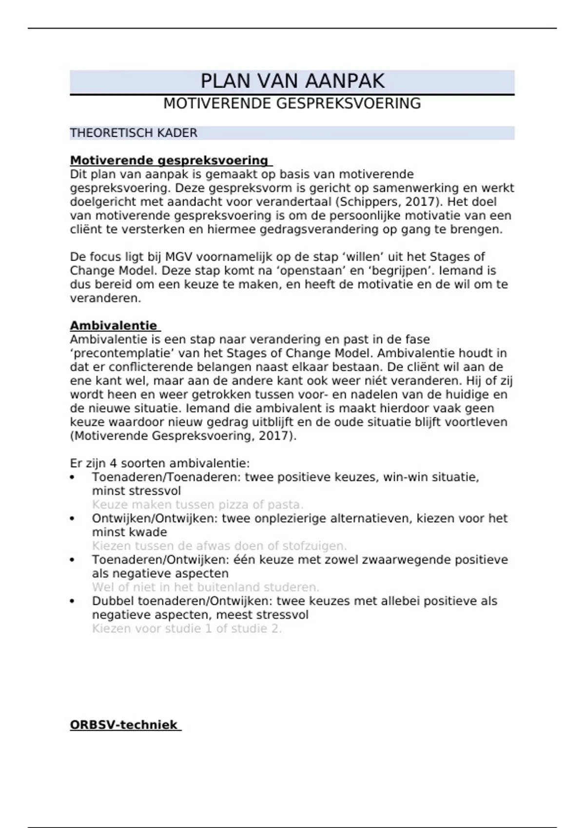 Samenvatting Plan van aanpak - Motiverende gespreksvoering