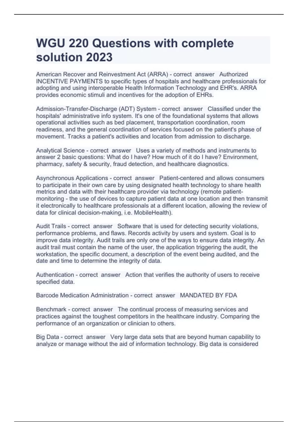 WGU 220 Questions with complete solution 2023 American Recover and Reinvestment Act (ARRA) - correct answer Authorized INCENTIVE PAYMENTS to specific types of hospitals and healthcare professionals for adopting and using interoperable Health Information Technology and EHR's. ARRA provides economic stimuli and incentives for the adoption of EHRs. Admission-Transfer-Discharge (ADT) System - correct answer Classified under the hospitals' administrative info system. It's one of the foundational systems that allows operational activities such as bed placement, transportation coordination, room readiness, and the general coordination of services focused on the patient's phase of movement. Tracks a patient's activities and location from admission to discharge. Analytical Science - correct answer Uses a variety of methods and instruments to answer 2 basic questions: What do I have? How much of it do I have? Environment, pharmacy, safety & security, fraud detection, and healthcare diagnostics. Asynchronous Applications - correct answer Patient-centered and allows consumers to participate in their own care by using designated health technology to share health metrics and data with their healthcare provider via technology (remote patient-monitoring - the use of devices to capture patient data at one location and then transmit it electronically to healthcare professionals at a different location, allowing the review of data for clinical decision-making, i.e. MobileHealth). Audit Trails - correct answer Software that is used for detecting security violations, performance problems, and flaws. Records activity by users and system. Goal is to improve data integrity. Audit trails are only one of the ways to ensure data integrity. An audit trail must contain the name of the user, the application triggering the audit, the workstation, the specific document, a description of the event being audited, and the date and time to determine the integrity of data. Authentication - correct answer Action that verifies the authority of users to receive specified data. Barcode Medication Administration - correct answer MANDATED BY FDA Benchmark - correct answer The continual process of measuring services and practices against the toughest competitors in the healthcare industry. Comparing the performance of an organization or clinician to others. Big Data - correct answer Very large data sets that are beyond human capability to analyze or manage without the aid of information technology