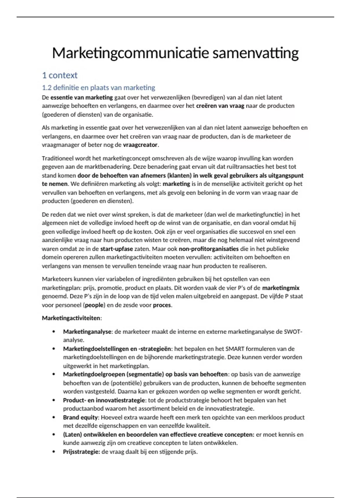 Deze samenvatting van bijna 40 bladzijdes is rijk aan informatie en biedt voldoende houvast voor het vak marketingcommunicatie. Alle hoofdstukken die getoetst worden staan in deze samenvatting. Alle (hoor)college's en het boek kun je hierin ook terugvinden. Ik hoop dat deze samenvatting helpt om zo een mooie voldoende te halen. Succes!