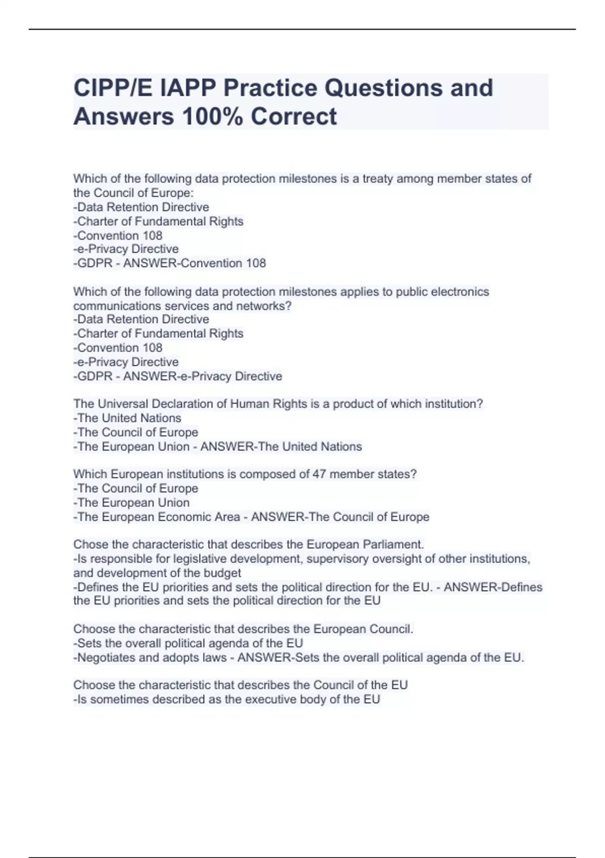 CIPP/E IAPP Practice Questions and Answers 100% CorrectCIPP/E IAPP Practice Questions and Answers 100% CorrectCIPP/E IAPP Practice Questions and Answers 100% CorrectCIPP/E IAPP Practice Questions and Answers 100% CorrectCIPP/E IAPP Practice Questions and Answers 100% Correct Which of the following data protection milestones is a treaty among member states of the Council of Europe: -Data Retention Directive -Charter of Fundamental Rights -Convention 108 -e-Privacy Directive -GDPR - ANSWER-Convention 108 Which of the following data protection milestones applies to public electronics communications services and networks? -Data Retention Directive -Charter of Fundamental Rights -Convention 108 -e-Privacy Directive -GDPR - ANSWER-e-Privacy Directive The Universal Declaration of Human Rights is a product of which institution? -The United Nations -The Council of Europe -The European Union - ANSWER-The United Nations Which European institutions is composed of 47 member states? -The Council of Europe -The European Union -The European Economic Area - ANSWER-The Council of Europe Chose the characteristic that describes the European Parliament. -Is responsible for legislative development, supervisory oversight of other institutions, and development of the budget -Defines the EU priorities and sets the political direction for the EU. - ANSWER-Defines the EU priorities and sets the political direction for the EU Choose the characteristic that describes the European Council. -Sets the overall political agenda of the EU