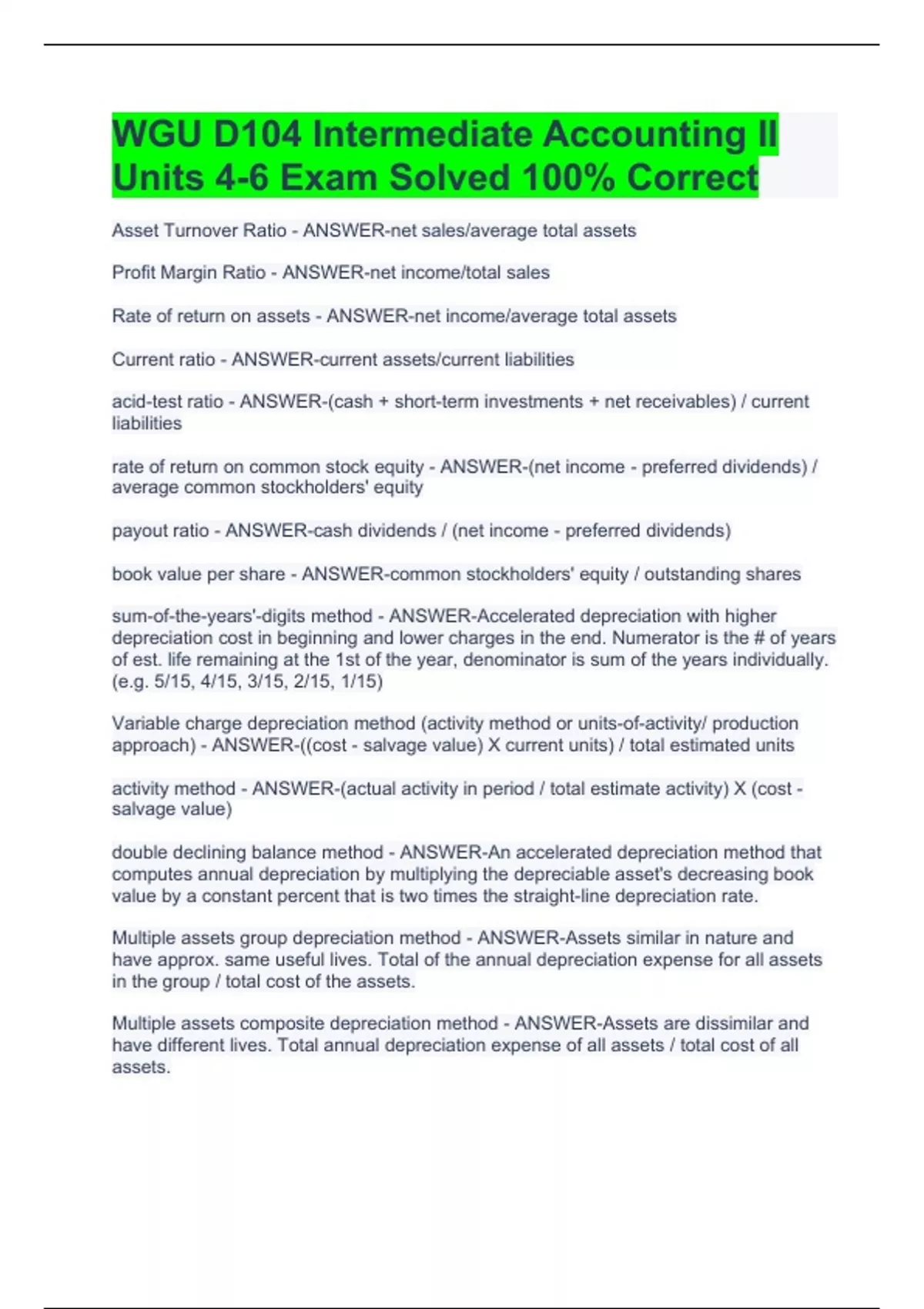 Asset Turnover Ratio - ANSWER-net sales/average total assets Profit Margin Ratio - ANSWER-net income/total sales Rate of return on assets - ANSWER-net income/average total assets Current ratio - ANSWER-current assets/current liabilities acid-test ratio - ANSWER-(cash + short-term investments + net receivables) / current liabilities rate of return on common stock equity - ANSWER-(net income - preferred dividends) / average common stockholders' equity payout ratio - ANSWER-cash dividends / (net income - preferred dividends) book value per share - ANSWER-common stockholders' equity / outstanding shares sum-of-the-years'-digits method - ANSWER-Accelerated depreciation with higher depreciation cost in beginning and lower charges in the end. Numerator is the # of years of est. life remaining at the 1st of the year, denominator is sum of the years individually. (e.g. 5/15, 4/15, 3/15, 2/15, 1/15) Variable charge depreciation method (activity method or units-of-activity/ production approach) - ANSWER-((cost - salvage value) X current units) / total estimated units activity method - ANSWER-(actual activity in period / total estimate activity) X (cost - salvage value) double declining balance method - ANSWER-An accelerated depreciation method that computes annual depreciation by multiplying the depreciable asset's decreasing book value by a constant percent that is two times the straight-line depreciation rate. Multiple assets group depreciation method - ANSWER-Assets similar in nature and have approx. same useful lives. Total of the annual depreciation expense for all assets in the group / total cost of the assets. Multiple assets composite depreciation method - ANSWER-Assets are dissimilar and have different lives. Total annual depreciation expense of all assets / total cost of all assets. Composite life - ANSWER-(Original cost - salvage value) / total annual depreciation Composite depreciation rate - ANSWER-Total annual depreciation of all assets / total cost of all assets. Journal entry for gain on sale of composite depreciation equipment - ANSWER-Debit cash & accumulated depreciation (subtract gain), credit equipment. Impairment - ANSWER-If the carrying amount exceeds the undiscounted future cash flows. Loss = carrying amount > fair value. Journal entry for impairment - ANSWER-Debit impairment loss, credit accumulated depreciation When is the restoration of an impairment loss permitted? - ANSWER-When an assets is held for disposal. Impairment loss is reported at the lower of cost or net realizable value (fair value - cost to sell/dispose) not to exceed amount of initial impairment loss. Depletion base for natural resources - ANSWER-(cost to acquire + cost to explore + cost to develop i.e. intangible costs + cost to restore). Tangible costs to extract resources depreciated separately. Natural resources depletion rate - ANSWER-(depletion base - salvage value) / total units to be recovered. Natural resources depletion expense - ANSWER-(depletion rate X units of usage) / extracted Journal entry to record ore extracted - ANSWER-Debit inventory (ore), credit mineral mine Journal entry to record the ore sold - ANSWER-Debit cost of goods sold, credit inventory (ore) Journal entry to record depletion expense for mine - ANSWER-Debit depletion expense, credit accumulated depletion Types of current liabilities - ANSWER-Accounts payable, notes payable, dividends payable, customer advances/deposits, unearned (deferred) revenues, sales tax payable, current maturities of long-term debt Journal entry to record issuance of a note - ANSWER-Debit cash, credit notes payable Journal entry to record payment of the note at maturity - ANSWER-Debit notes payable, debit interest expense, credit cash