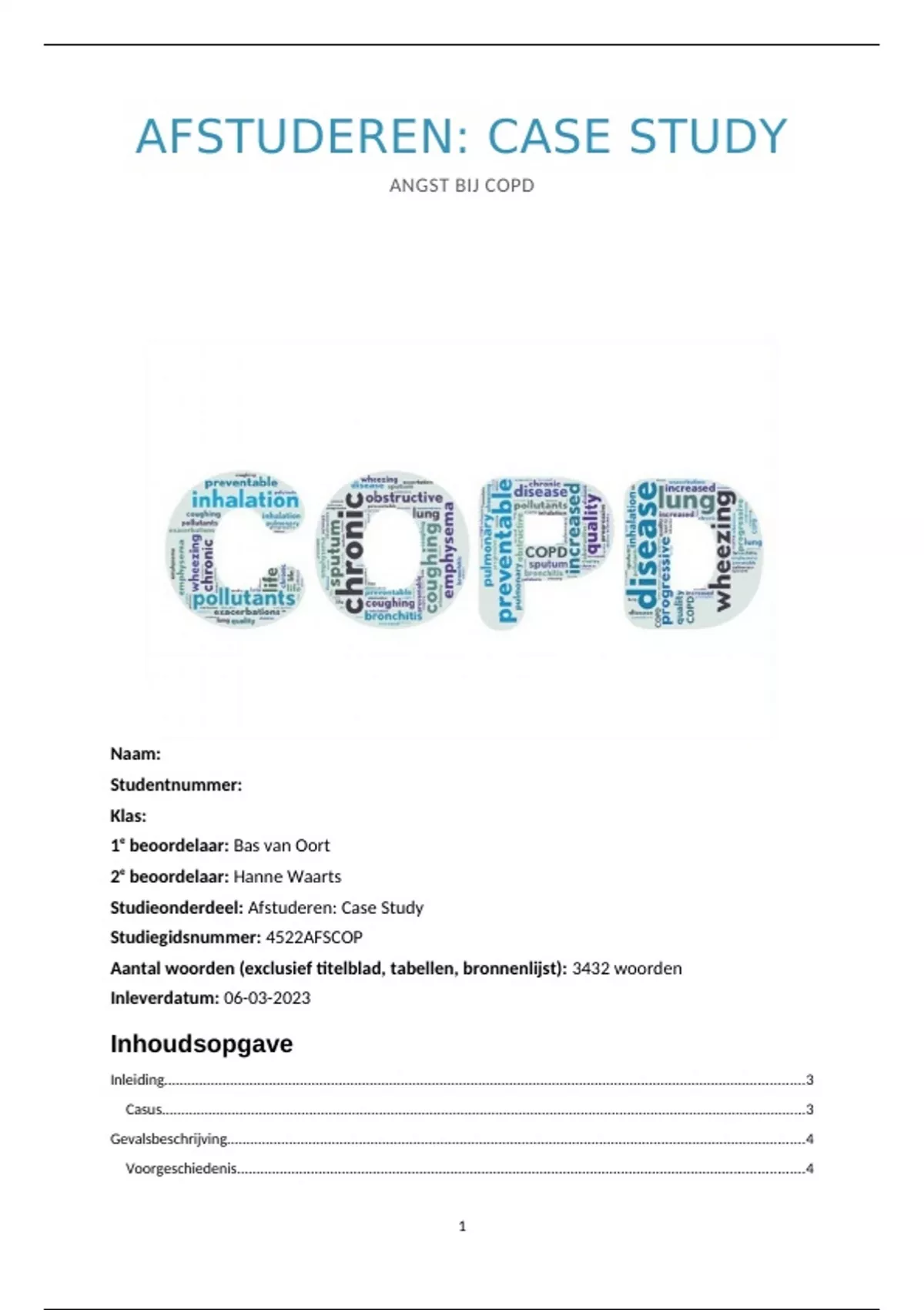 Dit is de afstudeeropdracht Case Study uit jaar 4 van de opleiding HBO-Verpleegkunde. Het onderwerp is angst bij COPD. Ik heb voor deze afstudeeropdracht een 6,1 gehaald.