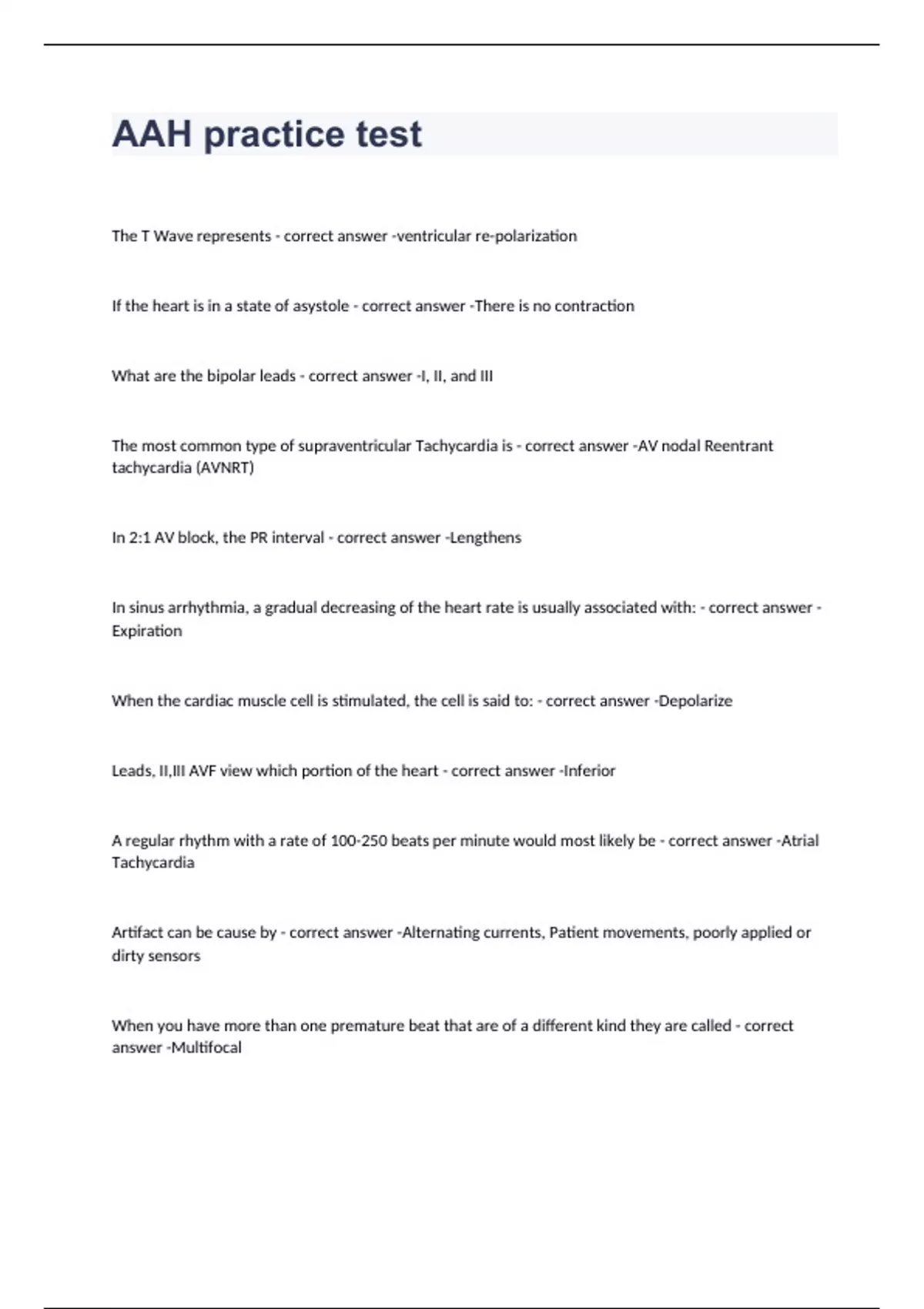 The T Wave represents ventricular re-polarization If the heart is in a state of asystole There is no contraction What are the bipolar leads I, II, and III The most common type of supraventricular Tachycardia is AV nodal Reentrant tachycardia (AVNRT) In 2:1 AV block, the PR interval Lengthens In sinus arrhythmia, a gradual decreasing of the heart rate is usually associated with: Expiration When the cardiac muscle cell is stimulated, the cell is said to: Depolarize Leads, II,III AVF view which portion of the heart Inferior A regular rhythm with a rate of 100-250 beats per minute would most likely be Atrial Tachycardia Artifact can be cause by Alternating currents, Patient movements, poorly applied or dirty sensors When you have more than one premature beat that are of a different kind they are called Multifocal What is the rate range for junctional tachycardia? 100-180 Another name for the S-A node is Pacemaker