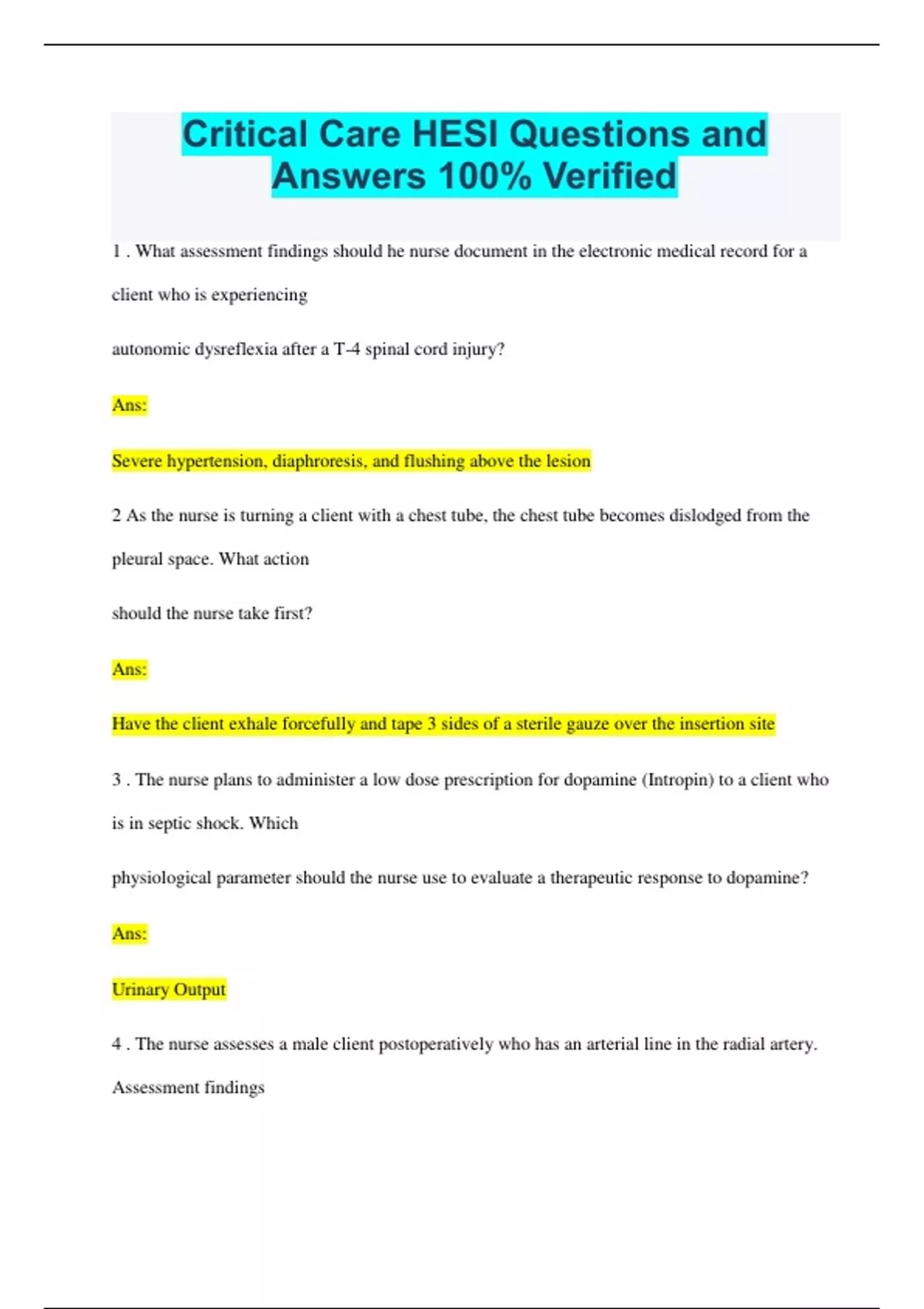 Critical Care HESI Questions and Answers 100% Verified 1 . What assessment findings should he nurse document in the electronic medical record for a client who is experiencing autonomic dysreflexia after a T-4 spinal cord injury? Ans: Severe hypertension, diaphroresis, and flushing above the lesion 2 As the nurse is turning a client with a chest tube, the chest tube becomes dislodged from the pleural space. What action should the nurse take first? Ans: Have the client exhale forcefully and tape 3 sides of a sterile gauze over the insertion site 3 . The nurse plans to administer a low dose prescription for dopamine (Intropin) to a client who is in septic shock. Which physiological parameter should the nurse use to evaluate a therapeutic response to dopamine? Ans: Urinary Output 4 . The nurse assesses a male client postoperatively who has an arterial line in the radial artery. Assessment findings include pallor, parastesia, and slow capillary refill in the client's right hand fingers. What action should the nurse plan? Ans: Notify the HCP 5 . A male client is admitted to the cardiac intensive unit with chest pain that began twelve hours ago. The nurse recognizes increased ventricular ectopy? Based on this assessment finding, what actions is most important for the nurse to implement? Ans: Initiate the unit's antiarrhythmic protocol if symptomatic. 6 . The nurse is assessing a client who was admitted 24 hours ago to the critical care unit following a motorcycle collision. Which client finding requires intervention by the nurse to reduce the risk for complication related to increased intracranial pressure? Ans: Change of PaCo2 to 55 mm Hg following ventilator setting adjustments 7 . A client is receiving cardiopulmonary resuscitation. After asystole is confirmed in two leads and sending for the transcutaneous pacemaker, which intravenous medication should be administered? Ans: Epinephrine 8 . The nurse performs a prescribed neurological check at the beginning of the shift on a client who was admitted to the hospital with a subarachnoid brain attack (stroke). The client's Glasgow coma scale is 9. What information is most important for the nurse to determine? Ans: The client's previous GCS score 9 . The healthcare provider prescribes a STAT computerized tomography without contrast for a client who is exhibiting signs of an acute change in the level of consciousness. The nurse is caring for two additional intensive care clients and has an unlicensed assistive personnel assigned to assist with the delivery of care. What action should the nurse take? Ans: Administered the schedule medications prior to transporting the client to CT scan. 10 . The healthcare provider prescribes and IV fluid bolus for a client who was admitted two hours ago to the ICU because of adrenal crisis. The client is confused and uncooperative. The nurse has attempted two times to obtain IV access without success. Which intervention should the nurse implement first? Ans: Ask another nurse to attempt insertion of IV 11 . Arterial blood gas results indicate that a client with respiratory failure who is being mechanically ventilated has respiratory acidosis. The ventilator rate is set at 6 breaths/minute, pressure support at 10 cm H2O and oxygen concentration of 30%. Which action should help correct the client's acidosis? - Provide manual resuscitation - Increase oxygen concentration - Decrease the pressure support - Increase the ventilator rate Ans: - Provide manual resuscitation 12 . An adult present to the emergency department with complaints of epigastric discomfort. The client reports shortness of breath and fatigue for the past two days. Which action should the nurse implement first? - Place leads for an electrocardiogram - Administer an antacid per protocol - Obtain a blood specimen for cardiac enzymes - Ask if taking non-steroidal anti-inflammatory drugs Ans: - Place leads for an electrocardiogram 13 . The nurse identifies the collaborative problem of potential electrolyte imbalance in a patient with acute pancreatitis. What assessment findings alert the nurse to an electrolyte imbalance associated with acute pancreatitis? Ans: - Muscle twitching and digit numbness 14 . A client who sustained severe liver laceration in a motorcycle collision is transported to ICU following a segmental resection of the liver. One hour later, the nurse notes that the client is hemorrhaging from surgical site. What action should the nurse take? Ans: - Prepare the client to return to the operating room 15. A comatose client requires suctioning q4h. What is the best parameter for the nurse to use to determine effectiveness of tracheal suctioning? - Arterial blood gas levels - Serum hemoglobin - Pulse rate/HR - Capillary refill - Arterial blood gas levels 16. The nurse is assisting the healthcare provider during the insertion of a pulmonary artery (PA) catheter into a client with heart failure. While the PA catheter is advanced the nurse observes the monitor. Which sequence of pressure readings on the hemodynamic monitor indicate the PA is advancing? Ans: - Right atrium, right ventricle, pulmonary artery, and pulmonary artery wedge 17. A male client is admitted to the neurological unit. He has sustained a C-5 spinal cord injury. Which assessment finding of this client warrants immediate intervention by the nurse? Ans: - Respirations are shallow, labored, and 14 breaths/min 18. The nurse is calculating fluid resuscitation for a young adult male who was burned in a boating accident at 12 noon and is seen in the emergency center at 2 pm. The HCP determines that the client has burns over 30% of his body, mainly on the arms and chest. Using the Parkland formula for fluid resuscitation the client is to receive 7, 000 ml of fluids in 24 hours. Which goal should the nurse establish for this client's plan of care? Ans: - By 8pm, the client will have received 3,500 ml of fluids 19. A male client with an implanted cardioverter/defibrillator reports to the