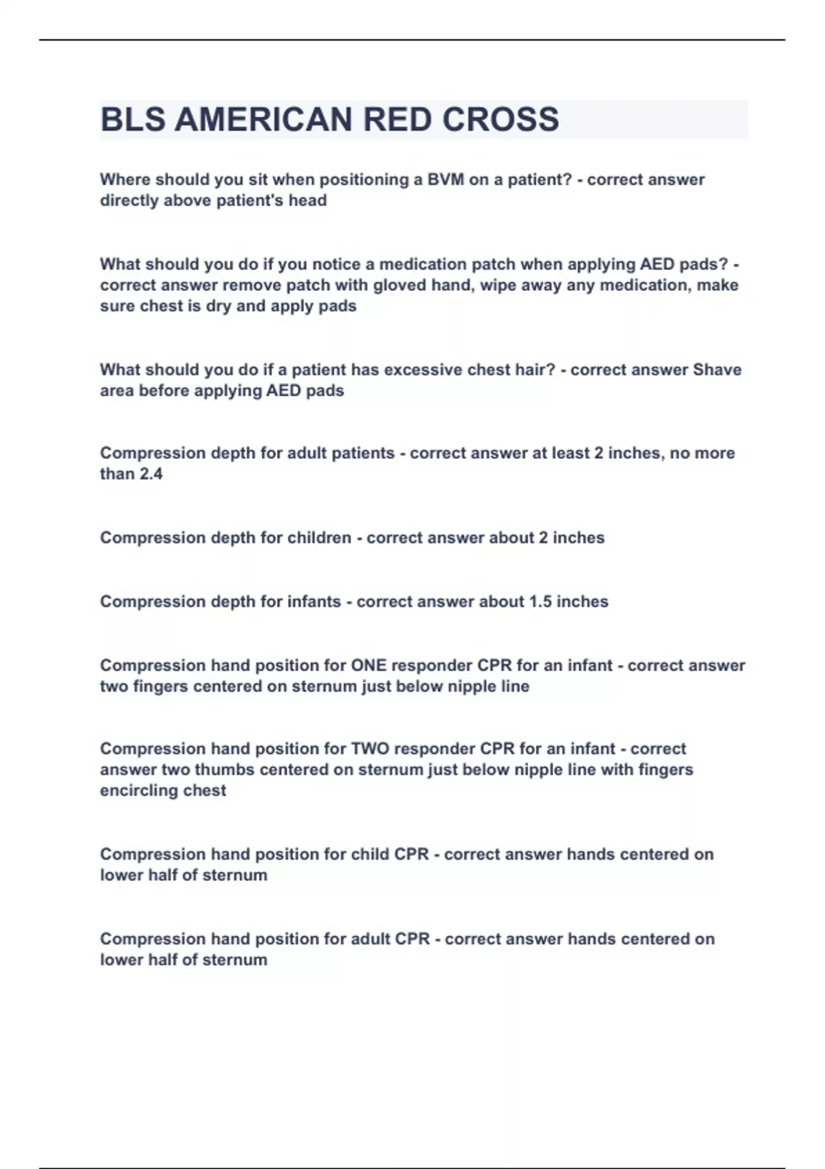 Where should you sit when positioning a BVM on a patient? directly above patient's head What should you do if you notice a medication patch when applying AED pads? remove patch with gloved hand, wipe away any medication, make sure chest is dry and apply pads What should you do if a patient has excessive chest hair? Shave area before applying AED pads Compression depth for adult patients at least 2 inches, no more than 2.4 Compression depth for children about 2 inches Compression depth for infants about 1.5 inches Compression hand position for ONE responder CPR for an infant two fingers centered on sternum just below nipple line Compression hand position for TWO responder CPR for an infant two thumbs centered on sternum just below nipple line with fingers encircling chest Compression hand position for child CPR hands centered on lower half of sternum Compression hand position for adult CPR hands centered on lower half of sternum Universal rate of compressions 100-120/minute Compression/ventilation ratio for adult 30:2 Compression/ventilation ratio for a child, ONE responder 30:2 Compression/ventilation ratio for a child, TWO responders 15:2 Compression/ventilation ratio for an infant, ONE responder 30:2