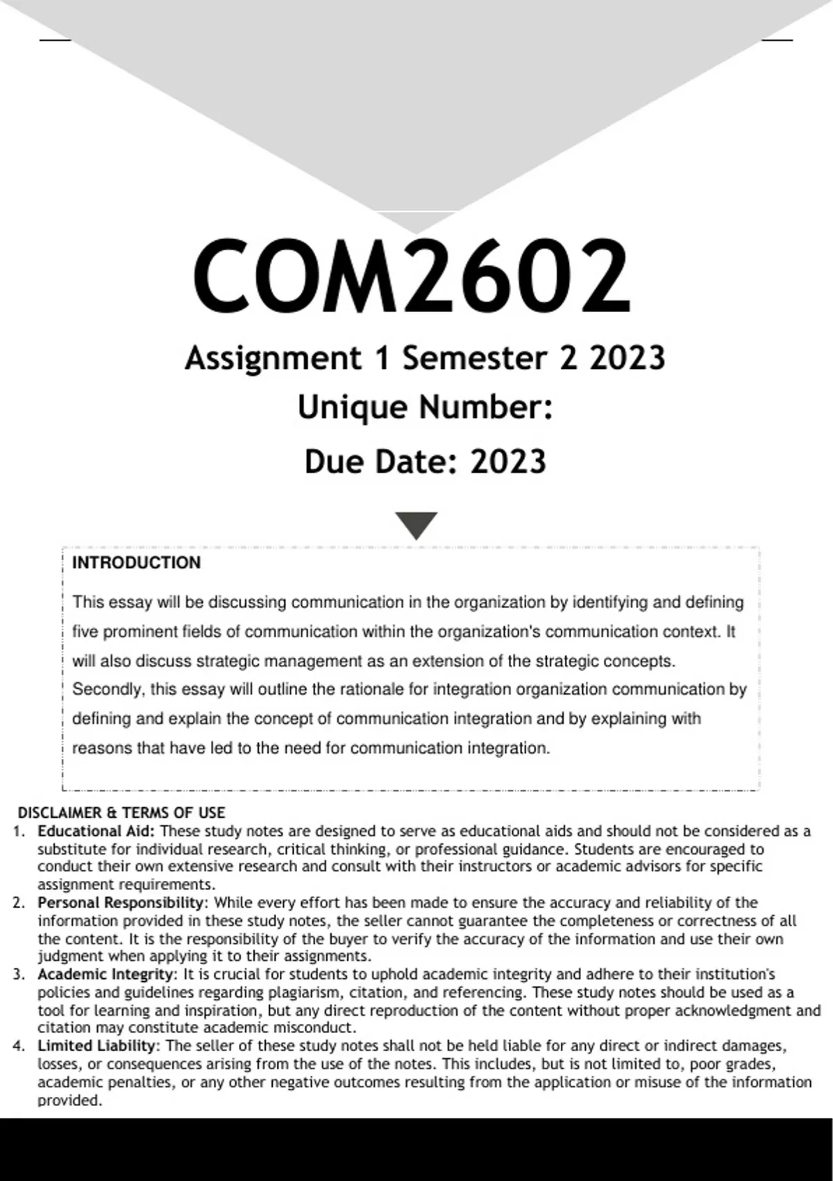 Well-structured COM2602 Assignment 1 (ANSWERS) Semester 2 2023 - DISTINCTION GUARANTEED. (DETAILED ANSWERS - DISTINCTION GUARANTEED!). QUESTION 1 COMMUNICATION IN THE ORGANISATION 1.1 You are a manager at Ngwanango Communications, an organisational communications teaching and training firm based in Pretoria. You are tasked with introducing the Organisational Communication chapter to first year student, giving an overview of what organisational communication is, and its constituent fields. While preparing your presentation slides name and discuss each of the five fields and provide real practical examples for each. (16) 1.2 Briefly explain each of the following concepts of strategy and indicate the levels of strategy they are connected to: 1.2.1 Strategy communication (3) 1.2.2 Communication strategy (3) 1.2.3 Communication of strategy (3) [25] QUESTION 2 THE RATIONALE FOR INTEGRATING ORGANISATIONS’ COMMUNICATION According to Angelopulo and Barker (2013:41), communication integration “has its origins in marketing communication and has expanded to include a full range of organisational communication fields”. In an effort to ensure maximum communication impact and message consistency, organisations across all sectors of the economy are beginning to embrace communication integration. You are the head of marketing and communication at a multi-campus college for further education and training. The college’s communication campaigns have been characterised by message inconsistencies and lack of synergy. This is because the college has managed its communication efforts in an uncoordinated way, leaving it to individual managers to decide on how to communicate. To make matters worse, the top management of the college does not understand the concept of communication integration with special reference to its definition, historical development and alignment of messages from various sources. As the head of marketing and communication at the college, you should do the following: 2.1 Define communication integration. (5) 2.2 Describe the alignment of messages from all sources. In your discussion, provide practical examples drawn from the scenario. (20) [25] QUESTION 3 COMMUNICATION INTEGRATION PROCESSES AND MANAGEMENT 3.1 You are the new communications manager of an International company and have decided to introduce the concept of communication integration. Explain, with examples to the board how you would implement integration using the ten divers of integration. (25) [25] COM2602/101/3/2023 15 QUESTION 4 INTEGRATED COMMUNICATION MEASUREMENT 4.1 Looking at dimensions of integrated communication evaluation and measurement, it has been observed that there are two ways of evaluating IMC, briefly discuss two ways in which IMC is evaluated. (6) 4.2 Discuss the three primary research tools used in the IM audit and provide examples for each tool. (9) [15]