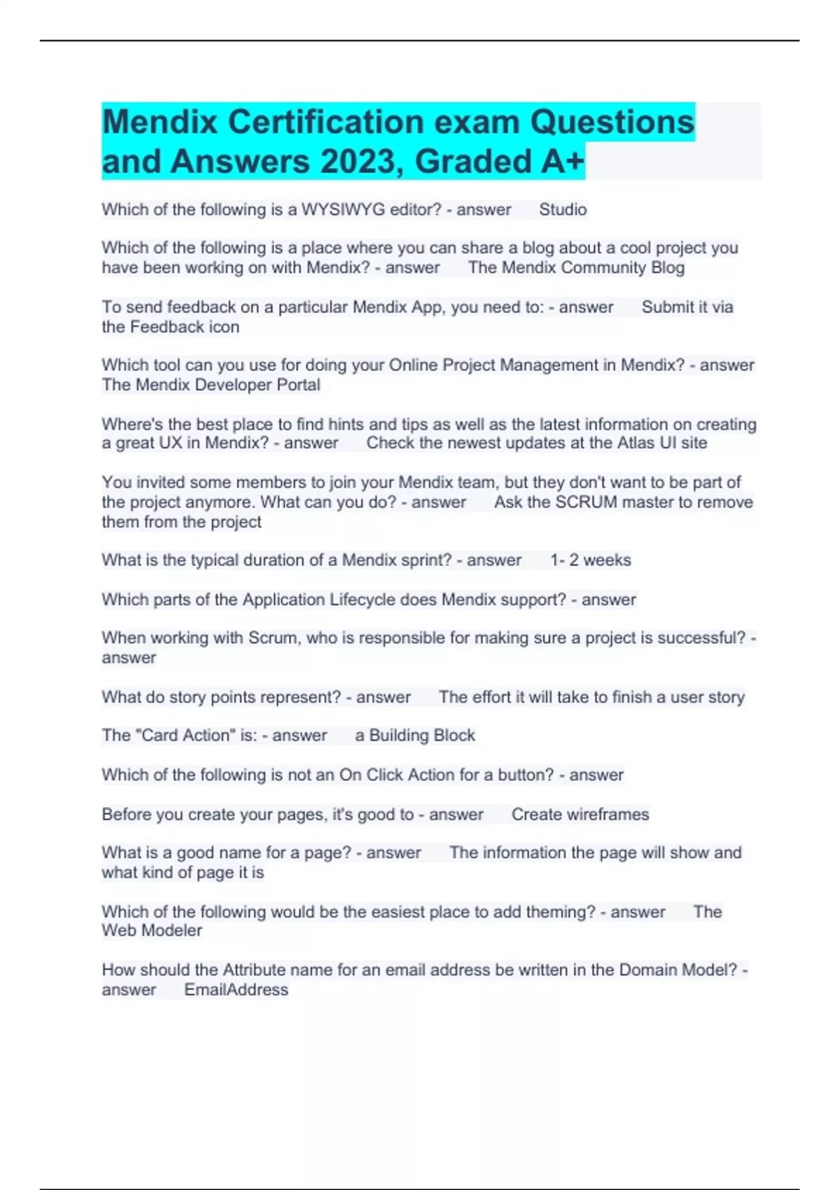 Mendix Certification exam Questions and Answers 2023, Graded A+ Which of the following is a WYSIWYG editor? Studio Which of the following is a place where you can share a blog about a cool project you have been working on with Mendix? The Mendix Community Blog To send feedback on a particular Mendix App, you need to: Submit it via the Feedback icon Which tool can you use for doing your Online Project Management in Mendix? The Mendix Developer Portal Where's the best place to find hints and tips as well as the latest information on creating a great UX in Mendix? Check the newest updates at the Atlas UI site You invited some members to join your Mendix team, but they don't want to be part of the project anymore. What can you do? Ask the SCRUM master to remove them from the project What is the typical duration of a Mendix sprint? 1- 2 weeks Which parts of the Application Lifecycle does Mendix support? ... When working with Scrum, who is responsible for making sure a project is successful? ... What do story points represent? The effort it will take to finish a user story The "Card Action" is: a Building Block Which of the following is not an On Click Action for a button? ... Before you create your pages, it's good to Create wireframes What is a good name for a page? The information the page will show and what kind of page it is Which of the following would be the easiest place to add theming? The Web Modeler How should the Attribute name for an email address be written in the Domain Model? EmailAddress When is it necessary to extend the Domain Model? When new dynamic data is needed in the app What is the purpose of adding a navigation menu in your app? Allow the user to find the pages that they are looking for It is possible to publish your app while it still has errors? false What is an object? An instance of an entity You want to explain the reason for adding an exclusive split to a microflow. What is the best way to do it? Add an annotation connected to the exclusive split The green bullet at the beginning of a microflow shows: the starting point of a microflow You want to add a button to your course overview page that will create a new TrainingEvent. What parameter should you pass to the microflow? The Course entity Which activity will you need if you use a microflow to schedule a new TrainingEvent. Create Object You can use a microflow to create: an object Which of the following is true? You can only commit when your working copy is up to date with the repository. If there are other changes, you have to update first When you create a new app from within the Developer Portal, the Team Server is automatically enabled. True What is a Parameter? Data that serves as input for a microflow Which of the following is considered good practice when committing to the repository? Committing small, consistent pieces of work The Connector is a part of Studio Pro that: Can be used to quickly connect an attribute to a widget or an entity to a list view You want to show a value converted using the latest exchange rates in your app. What is type of attribute is it best to use? Calculated attribute Which microflow expression, used in an exclusive split, shows that a Course has been selected? $TrainingEvent/TrainingEvent_Course != empty You want to trigger a microflow from an input widget. To make sure that the microflow is triggered the first time (from 'no selection' to a specific selection) you need to set the microflow to be triggered: ... You want to add an attribute to a microflow expression but it is not in the scope of the microflow. What can you do? ... What type of validation could ensure that the domain of an email address is @? Not equals, not required Where can you add validation in Mendix? Domain Model, Microflows, Pages Why would validation be performed in a Microflow rather than the Domain Model? ... What is delete behavior? It defines what happens to an associated object when an object is deleted. Before setting validation rules, which of the following needs to be created? Entities What is the relationship between User roles and Module roles? A User role is defined on Project level, and has Module roles assigned to it. Where can you create user roles? ... Module roles are connected to: User roles You configure the page access of an overview page, so that it does not display to specific user roles. What will happen to the navigation menu for that specific user role? ... You have already configured production level security. What needs to be done to make a Mendix application accessible to users that do not have accounts? You need to configure anonymous user access in the project security settings. You want trainees to only have access to certain features of the mobile-specific app. What do you need to do? Set the project security accordingly You want to use your app from your mobile phone. For that you need to create a mobile specific version of your app. false Which of the following widgets it is better not to use when developing an app specifically for mobile? Data grid You want to create a button that has conditional visibility. Where do you configure this? In the properties of the button Which layout is it best to use when creating an app for mobile? Phone Specific Where's the best place to find hints and tips as well as the latest information on creating a great UX in mendix? Check the newest updates at the Atlas UI site Which tool can you use for doing your Online Project Management in Mendix ? The Mendix Developer Portal You invited some members to join your Mendix team, but they don't want to be part of the project anymore. What can you do? Ask the SCRUM master to remove them from the project Mendix is best suited for: Agile What needs to be clearly stated in the User story ? The value of the user What is the result of a Sprint? A product increment In which stage of the Application Lifecycle are user stories created? Design?? NOT development You can preview the pages of the app on all