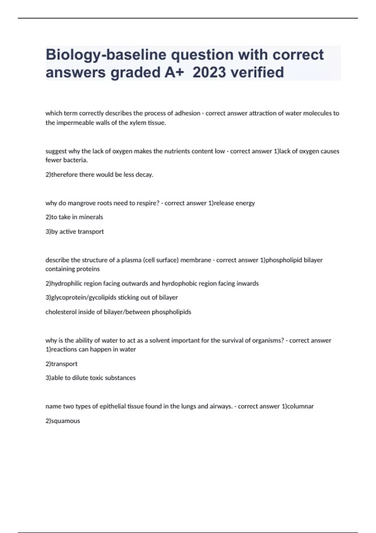 Biology-baseline question with correct answers graded A+ 2023 verifiedwhich term correctly describes the process of adhesion - correct answer attraction of water molecules to the impermeable walls of the xylem tissue. suggest why the lack of oxygen makes the nutrients content low - correct answer 1)lack of oxygen causes fewer bacteria. 2)therefore there would be less decay. why do mangrove roots need to respire? - correct answer 1)release energy 2)to take in minerals 3)by active transport describe the structure of a plasma (cell surface) membrane - correct answer 1)phospholipid bilayer containing proteins 2)hydrophilic region facing outwards and hyrdophobic region facing inwards 3)glycoprotein/gycolipids sticking out of bilayer cholesterol inside of bilayer/between phospholipids why is the ability of water to act as a solvent important for the survival of organisms? - correct answer 1)reactions can happen in water 2)transport 3)able to dilute toxic substances name two types of epithelial tissue found in the lungs and airways. - correct answer 1)columnar 2)squamous