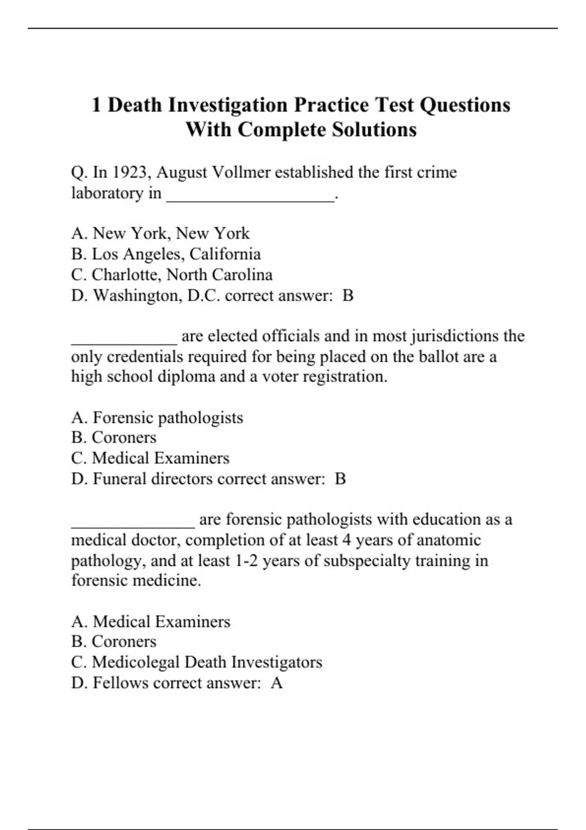 Q. In 1923, August Vollmer established the first crime laboratory in ___________________. A. New York, New York B. Los Angeles, California C. Charlotte, North Carolina D. Washington, D.C. correct answer: B ____________ are elected officials and in most jurisdictions the only credentials required for being placed on the ballot are a high school diploma and a voter registration. A. Forensic pathologists B. Coroners C. Medical Examiners D. Funeral directors correct answer: B ______________ are forensic pathologists with education as a medical doctor, completion of at least 4 years of anatomic pathology, and at least 1-2 years of subspecialty training in forensic medicine. A. Medical Examiners B. Coroners C. Medicolegal Death Investigators D. Fellows correct answer: A