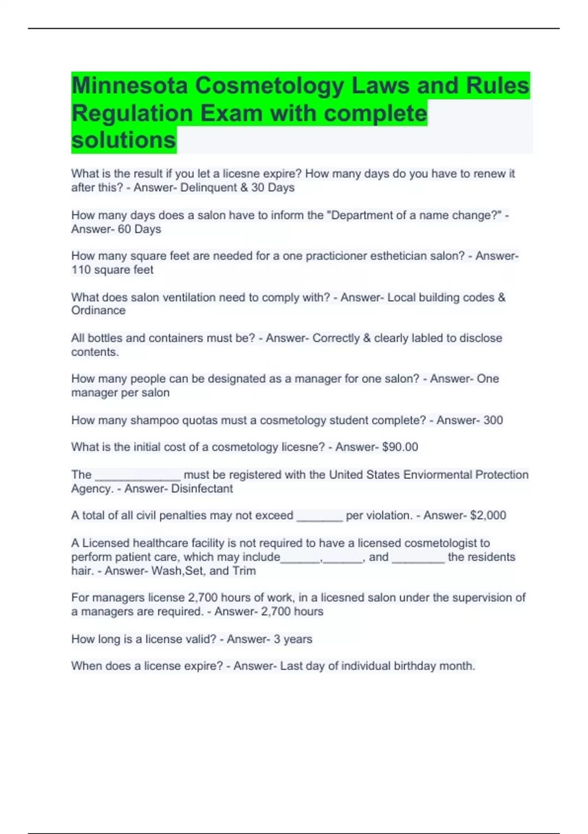 Minnesota Cosmetology Laws and Rules Regulation Exam with complete solutions