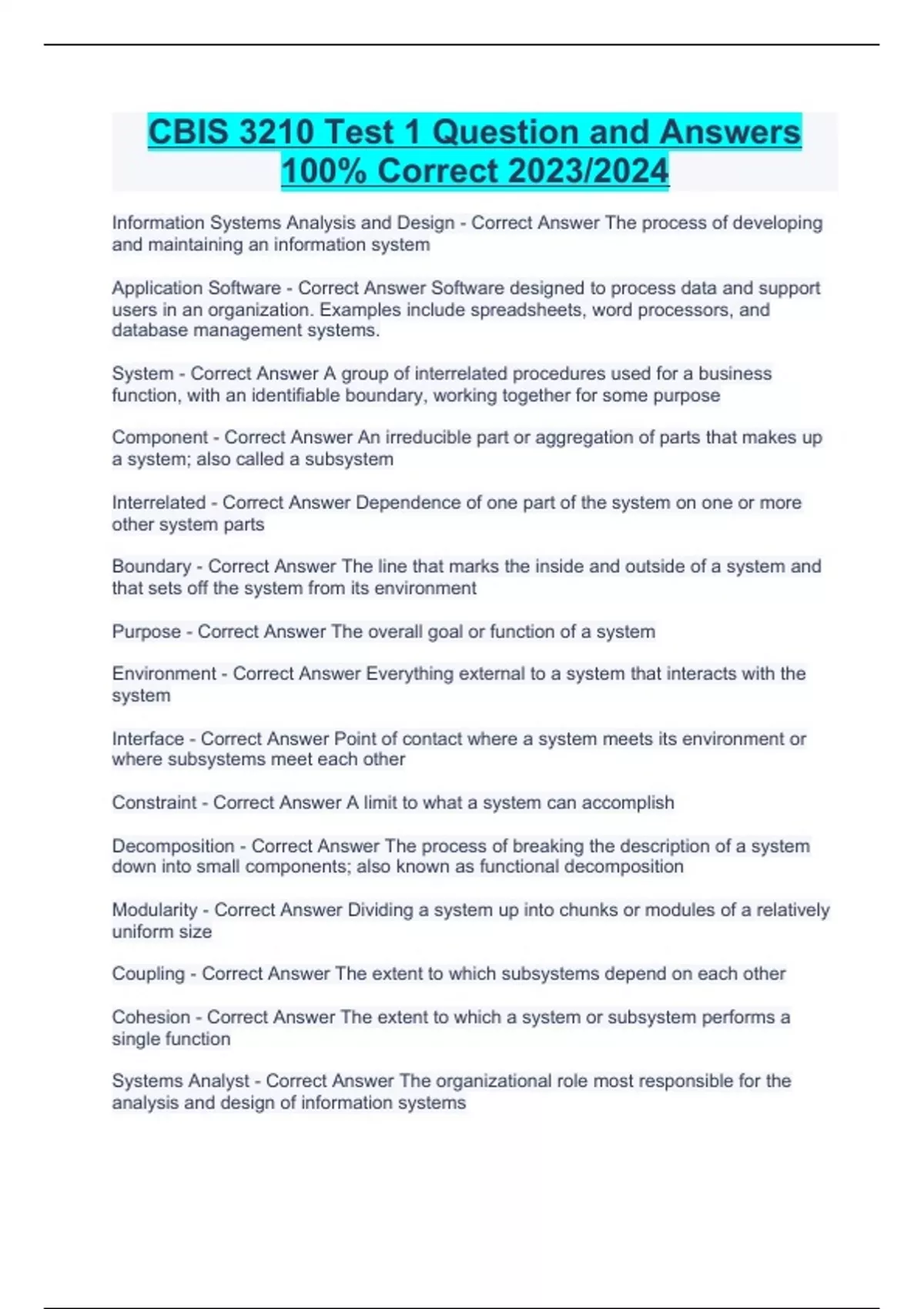 Information Systems Analysis and Design - Correct Answer The process of developing and maintaining an information system Application Software - Correct Answer Software designed to process data and support users in an organization. Examples include spreadsheets, word processors, and database management systems. System - Correct Answer A group of interrelated procedures used for a business function, with an identifiable boundary, working together for some purpose Component - Correct Answer An irreducible part or aggregation of parts that makes up a system; also called a subsystem Interrelated - Correct Answer Dependence of one part of the system on one or more other system parts Boundary - Correct Answer The line that marks the inside and outside of a system and that sets off the system from its environment Purpose - Correct Answer The overall goal or function of a system Environment - Correct Answer Everything external to a system that interacts with the system Interface - Correct Answer Point of contact where a system meets its environment or where subsystems meet each other Constraint - Correct Answer A limit to what a system can accomplish Decomposition - Correct Answer The process of breaking the description of a system down into small components; also known as functional decomposition Modularity - Correct Answer Dividing a system up into chunks or modules of a relatively uniform size Coupling - Correct Answer The extent to which subsystems depend on each other Cohesion - Correct Answer The extent to which a system or subsystem performs a single function Systems Analyst - Correct Answer The organizational role most responsible for the analysis and design of information systems