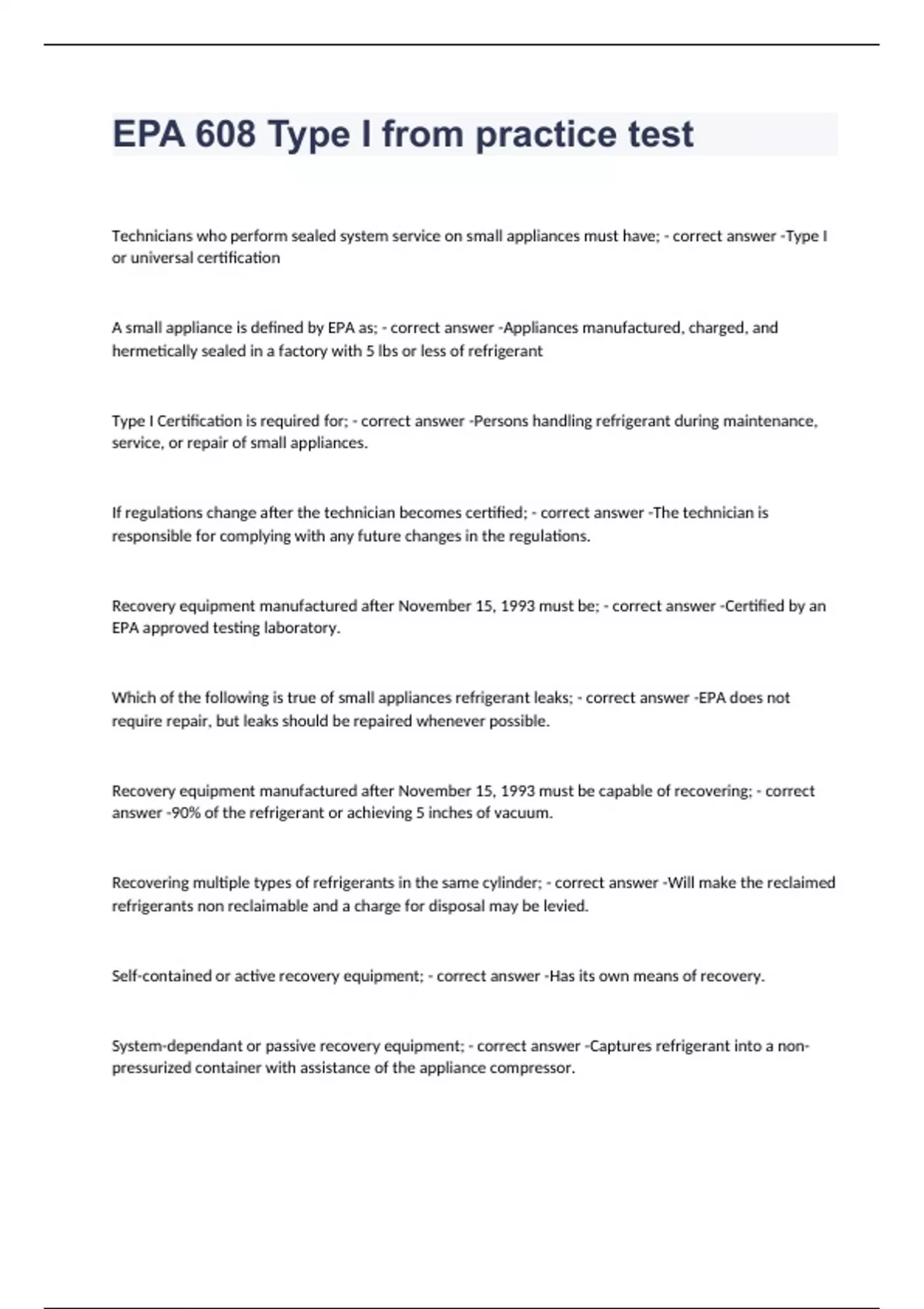 EPA 608 Type I from practice test exam 2023 with 100% correct answers