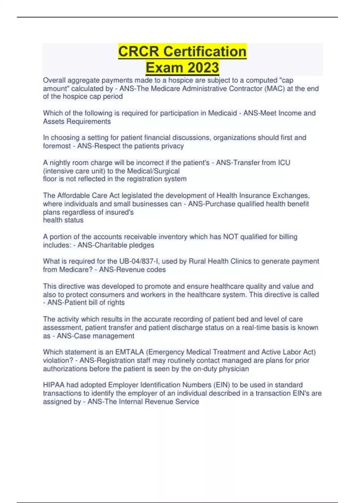 CRCR Certification Exam 2023 Overall aggregate payments made to a hospice are subject to a computed "cap amount" calculated by - ANS-The Medicare Administrative Contractor (MAC) at the end of the hospice cap period Which of the following is required for participation in Medicaid - ANS-Meet Income and Assets Requirements In choosing a setting for patient financial discussions, organizations should first and foremost - ANS-Respect the patients privacy A nightly room charge will be incorrect if the patient's - ANS-Transfer from ICU (intensive care unit) to the Medical/Surgical floor is not reflected in the registration system The Affordable Care Act legislated the development of Health Insurance Exchanges, where individuals and small businesses can - ANS-Purchase qualified health benefit plans regardless of insured's health status A portion of the accounts receivable inventory which has NOT qualified for billing includes: - ANS-Charitable pledges What is required for the UB-04/837-I, used by Rural Health Clinics to generate payment from Medicare? - ANS-Revenue codes This directive was developed to promote and ensure healthcare quality and value and also to protect consumers and workers in the healthcare system. This directive is called - ANS-Patient bill of rights The activity which results in the accurate recording of patient bed and level of care assessment, patient transfer and patient discharge status on a real-time basis is known as - ANS-Case management Which statement is an EMTALA (Emergency Medical Treatment and Active Labor Act) violation? - ANS-Registration staff may routinely contact managed are plans for prior authorizations before the patient is seen by the on-duty physician HIPAA had adopted Employer Identification Numbers (EIN) to be used in standard transactions to identify the employer of an individual described in a transaction EIN's are assigned by - ANS-The Internal Revenue Service Checks received through mail, cash received through mail, and lock box are all examples of - ANS-Control points for cash posting What are some core elements if a board-approved financial assistance policy? - ANSEligibility, application process, and nonpayment collection activities A recurring/series registration is characterized by - ANS-The creation of one registration record for multiple days of service With the advent of the Affordable Care Act Health Insurance Marketplaces and the expansion of Medicaid in some states, it is more important than ever for hospitals to - ANS-Assist patients in understanding their insurance coverage and their financial obligation The purpose of a financial report is to: - ANS-Present financial information to decision makers Patient financial communications best practices produce communications that are - ANS-Consistent, clear and transparent Medicare has established guidelines called the Local Coverage Determinations (LCD) and National Coverage Determinations (NCD) that establish - ANS-What services or healthcare items are covered under Medicare Any provider that has filed a timely cost report may appeal an adverse final decision received from the Medicare Administrative Contractor (MAC). This appeal may be filed with - ANS-The Provider Reimbursement Review Board Concurrent review and discharge planning - ANS-Occurs during service Duplicate payments occur: - ANS-When providers re-bill claims based on nonpayment from the initial bill submission An individual enrolled in Medicare who is dissatisfied with the government's claim determination is entitled to reconsideration of the decision. This type of appeal is known as - ANS-A beneficiary appeal Insurance verification results in which of the following - ANS-The accurate identification of the patient's eligibility and benefits The Medicare fee-for service appeal process for both beneficiaries and providers includes all of the following levels EXCEPT: - ANS-Judicial review by a federal district court Under EMTALA (Emergency Medical Treatment and Labor Act) regulations, the providermay not ask about a patient's insurance information if it would delay what? - ANS-Medical screening and stabilizing treatment Ambulance services are billed directly to the health plan for - ANS-Services provided before a patient is admitted and for ambulance rides arranged to pick up the patient from the hospital after discharge to take him/her home or to another facility Key performance indicators (KPIs) set standards for accounts receivables (A/R) and - ANS-Provide a method of measuring the collection and control of A/R he patient discharge process begins when - ANS-The physician writes the discharge orders The nightly room charge will be incorrect if the patient's - ANS-Transfer from ICU to the Medical/Surgical floor is not reflected in the registration system. The soft cost of a dissatisfied customer is - ANS-The customer passing on info about their negative experience to potential pts or through social media channels An advantage of a pre-registration program is - ANS-The opportunity to reduce the corporate compliance failures within the registration process It is important to have high registration quality standards because - ANS-Inaccurate or incomplete patient data will delay payment or cause denials Telemed seeks to improve a patient's health by - ANS-Permitting 2-way real time interactive communication between the patient and the clinical professional Any healthcare insurance plan that provides or ensures comprehensive health maintenance and treatment services for an enrolled group of persons based on a monthly fee is known as a - ANS-HMO Identifying the patient, in the MPI, creating the registration record, completing medical necessity screening, determining insurance eligibility and benefits resolving managed care, requirements and completing financial education/resolution are all - ANS-The data collection steps for scheduling and pre-registering a patient Medicare Part B has an annual deductible, and the beneficiary is respon