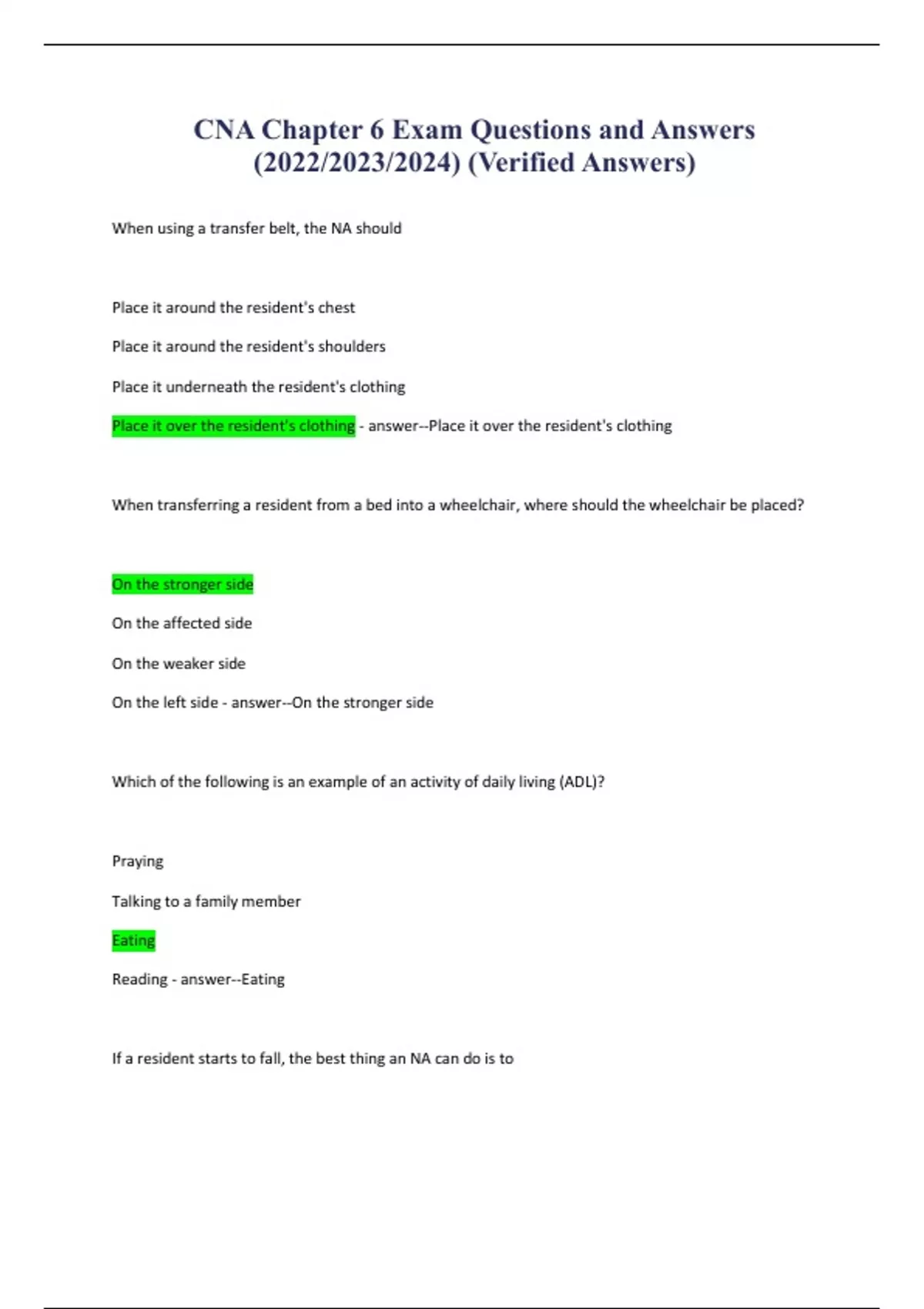 CNA Chapter 6 Exam Questions and Answers (2022/2023/2024) (Verified Answers)