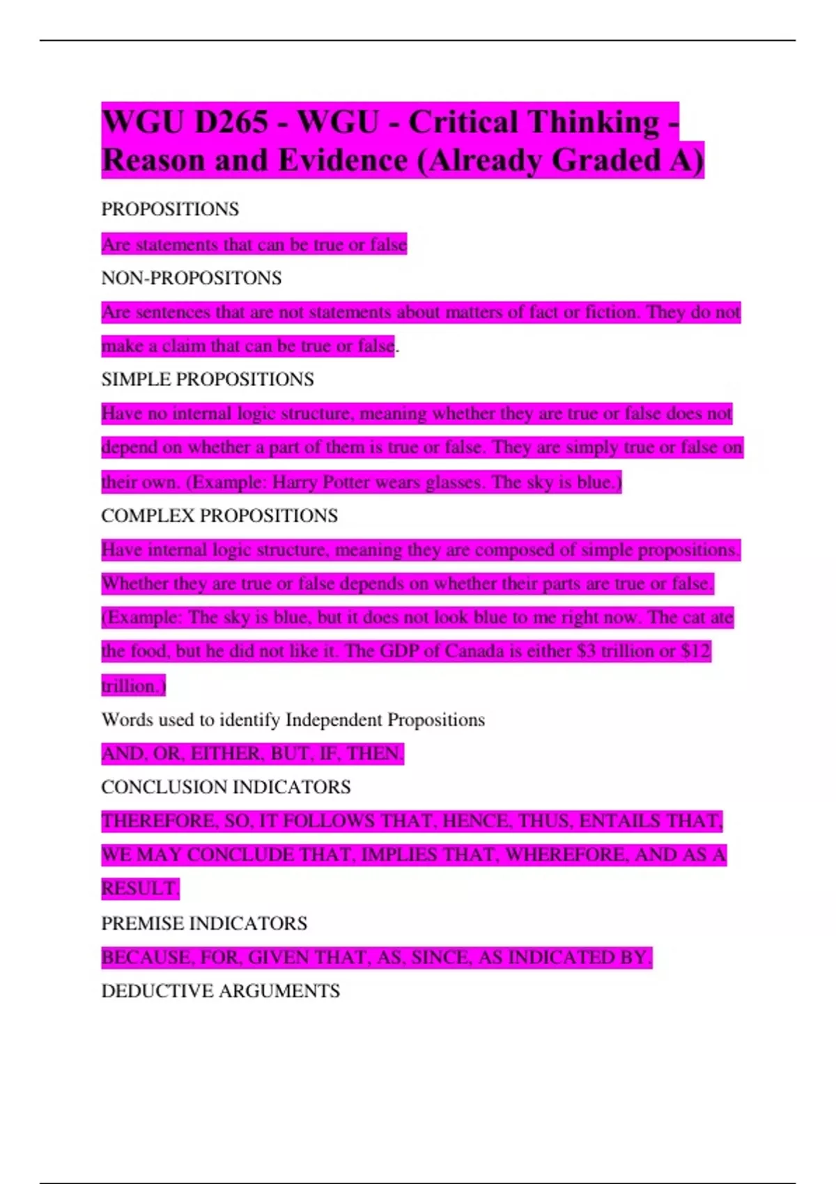 WGU D265 - WGU - Critical Thinking -Reason and Evidence (Answers 100% Correct)
