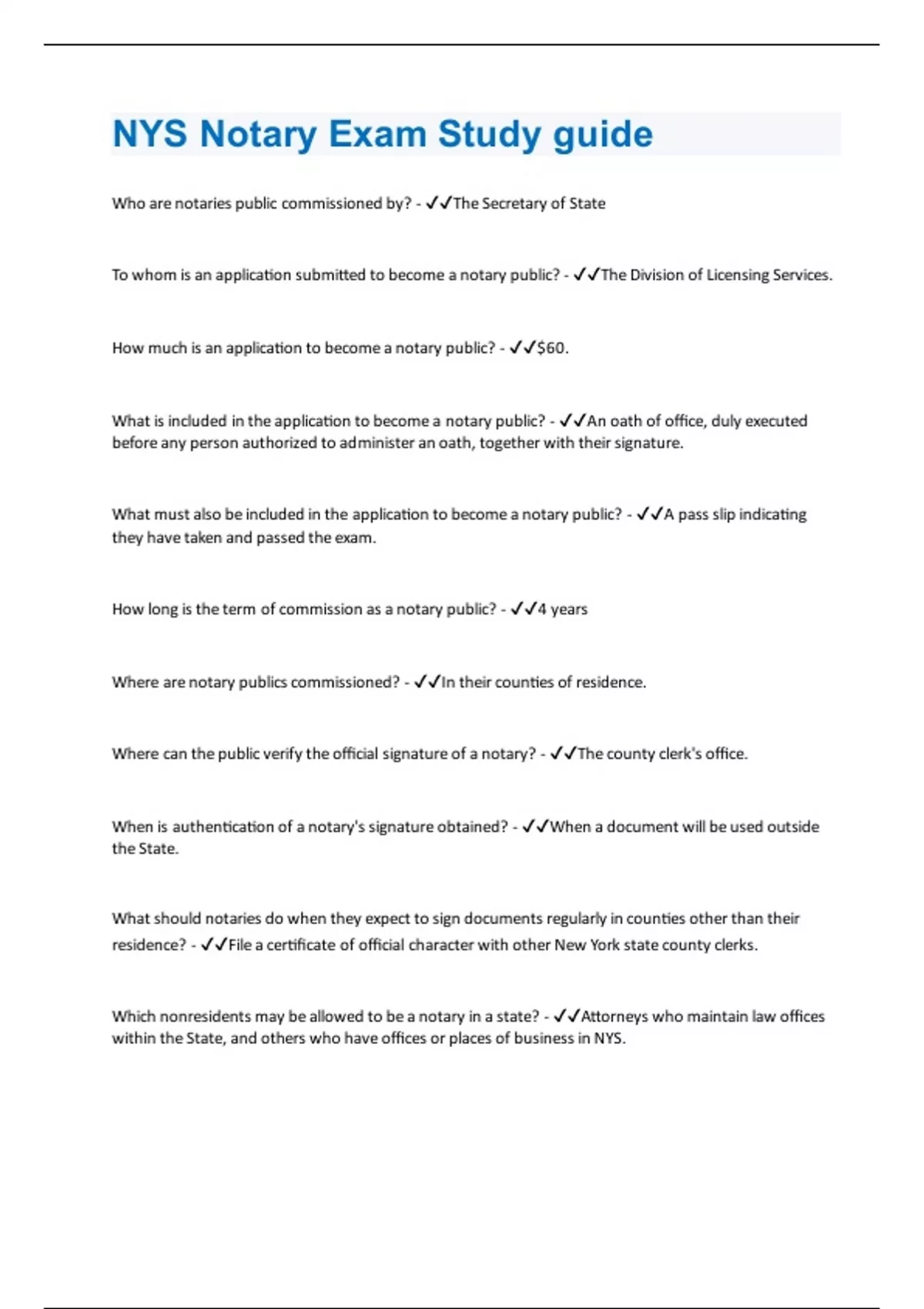 Who are notaries public commissioned by? - The Secretary of State To whom is an application submitted to become a notary public? - The Division of Licensing Services. How much is an application to become a notary public? - $60. What is included in the application to become a notary public? - An oath of office, duly executed before any person authorized to administer an oath, together with their signature. What must also be included in the application to become a notary public? - A pass slip indicating they have taken and passed the exam. How long is the term of commission as a notary public? - 4 years Where are notary publics commissioned? - In their counties of residence. Where can the public verify the official signature of a notary? - The county clerk's office. When is authentication of a notary's signature obtained? - When a document will be used outside the State. What should notaries do when they expect to sign documents regularly in counties other than their residence? - File a certificate of official character with other New York state county clerks. Which nonresidents may be allowed to be a notary in a state? - Attorneys who maintain law offices within the State, and others who have offices or places of business in NYS