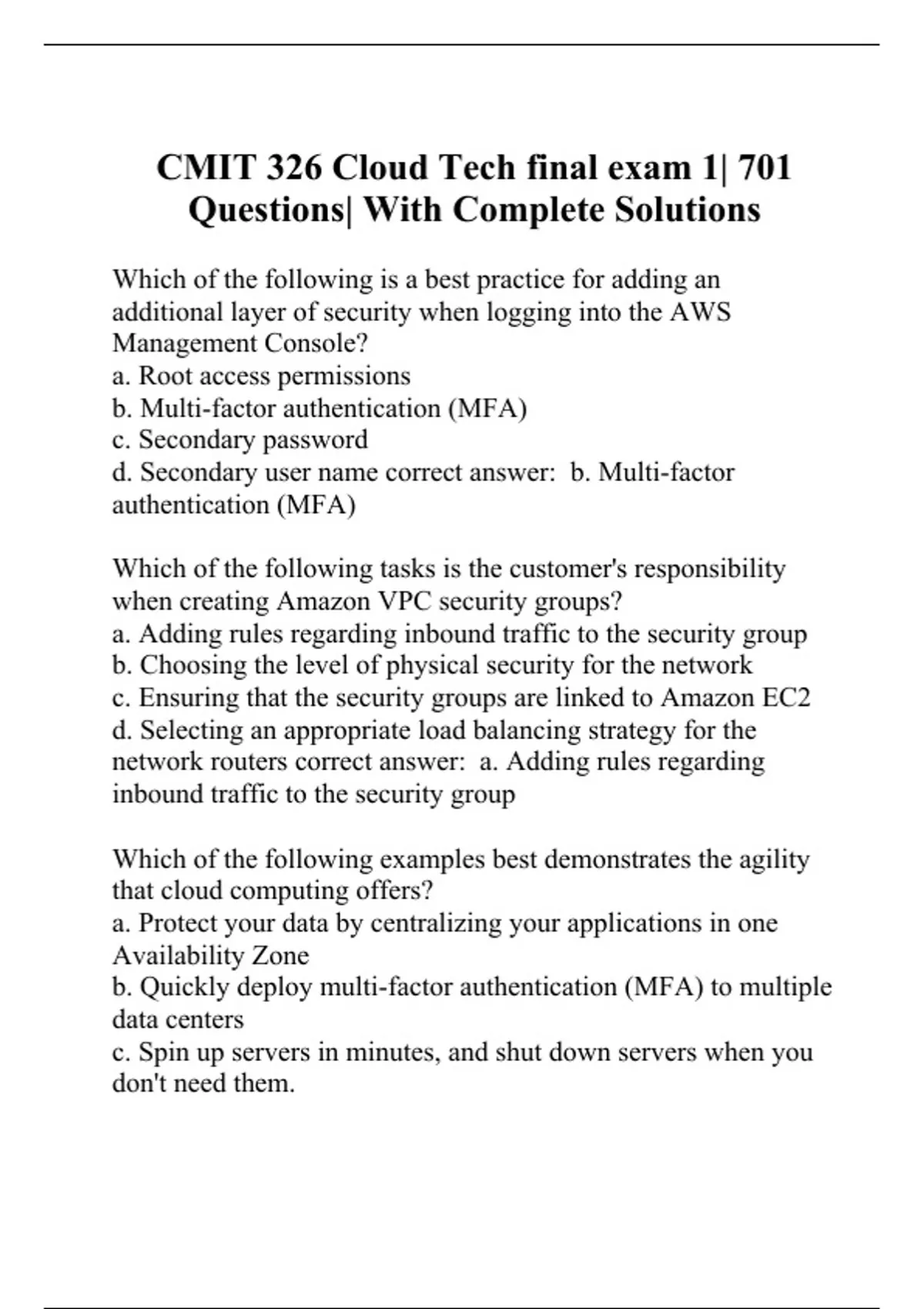 Which of the following is a best practice for adding an additional layer of security when logging into the AWS Management Console? a. Root access permissions b. Multi-factor authentication (MFA) c. Secondary password d. Secondary user name correct answer: b. Multi-factor authentication (MFA) Which of the following tasks is the customer's responsibility when creating Amazon VPC security groups? a. Adding rules regarding inbound traffic to the security group b. Choosing the level of physical security for the network c. Ensuring that the security groups are linked to Amazon EC2 d. Selecting an appropriate load balancing strategy for the network routers correct answer: a. Adding rules regarding inbound traffic to the security group Which of the following examples best demonstrates the agility that cloud computing offers? a. Protect your data by centralizing your applications in one Availability Zone b. Quickly deploy multi-factor authentication (MFA) to multiple data centers c. Spin up servers in minutes, and shut down servers when you don't need them. d. Increase network throughout with AWS Direct Connect (DX) nodes. correct answer: c. Spin up servers in minutes, and shut
