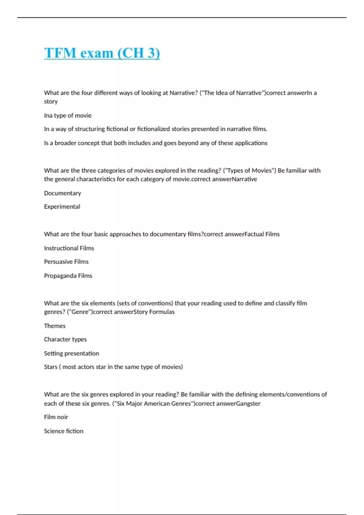 What are the four different ways of looking at Narrative? ("The Idea of Narrative") In a story Ina type of movie In a way of structuring fictional or fictionalized stories presented in narrative films. Is a broader concept that both includes and goes beyond any of these applications What are the three categories of movies explored in the reading? ("Types of Movies") Be familiar with the general characteristics for each category of movie. Narrative Documentary Experimental What are the four basic approaches to documentary films? Factual Films Instructional Films Persuasive Films Propaganda Films What are the six elements (sets of conventions) that your reading used to define and classify film genres? ("Genre") Story Formulas Themes Character types Setting presentation Stars ( most actors star in the same type of movies) What are the six genres explored in your reading? Be familiar with the defining elements/conventions of each of these six genres. ("Six Major American Genres") Gangster Film noir Science fiction Horror The western The musical How does animation differ from the other three basic types of movies? Animation is just a different form of movie making, not necessarily a singular type of movie What are the three basic types of animation? Stop motion Computer generated imagery (CGI) Hand drawn genre The categorization of narrative film by form, content, or both