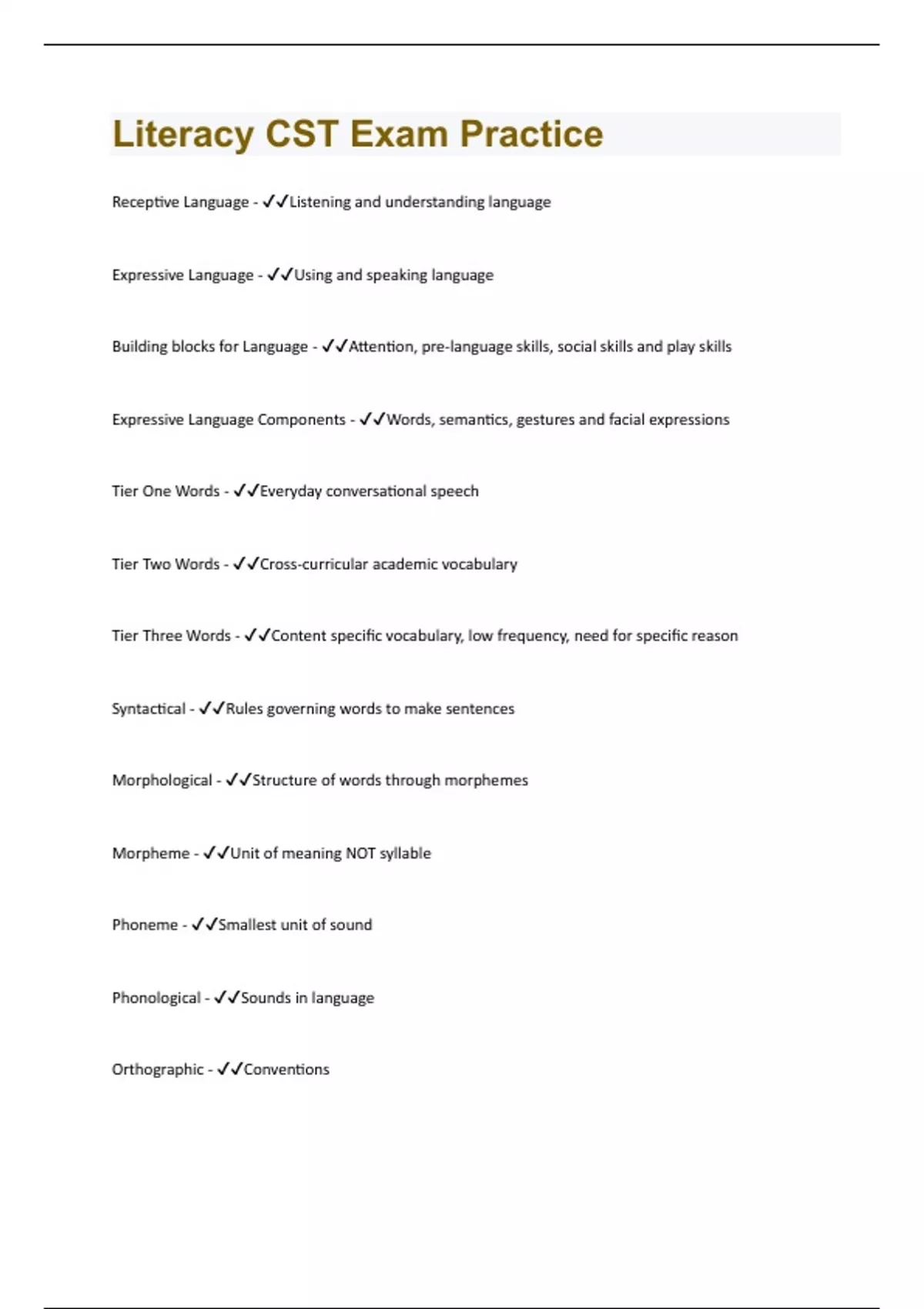Receptive Language - Listening and understanding language Expressive Language - Using and speaking language Building blocks for Language - Attention, pre-language skills, social skills and play skills Expressive Language Components - Words, semantics, gestures and facial expressions Tier One Words - Everyday conversational speech Tier Two Words - Cross-curricular academic vocabulary Tier Three Words - Content specific vocabulary, low frequency, need for specific reason Syntactical - Rules governing words to make sentences Morphological - Structure of words through morphemes Morpheme - Unit of meaning NOT syllable Phoneme - Smallest unit of sound Phonological - Sounds in language Orthographic - ConventionsSemantic - Meaning Discourse - Mode or context Emergent Literacy - Skills that are precursors to conventional reading and writing