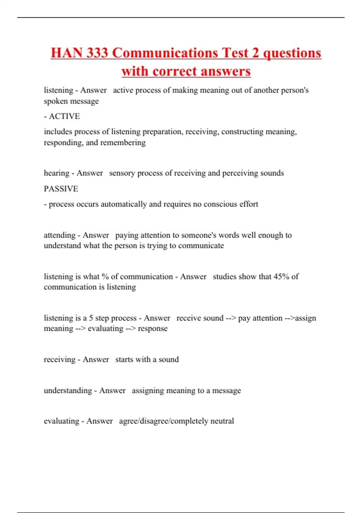 listening - Answer active process of making meaning out of another person's spoken message - ACTIVE includes process of listening preparation, receiving, constructing meaning, responding, and remembering hearing - Answer sensory process of receiving and perceiving sounds PASSIVE - process occurs automatically and requires no conscious effort attending - Answer paying attention to someone's words well enough to understand what the person is trying to communicate listening is what % of communication - Answer studies show that 45% of communication is listening listening is a 5 step process - Answer receive sound --> pay attention -->assign meaning --> evaluating --> response receiving - Answer starts with a sound understanding - Answer assigning meaning to a message evaluating - Answer agree/disagree/completely neutral