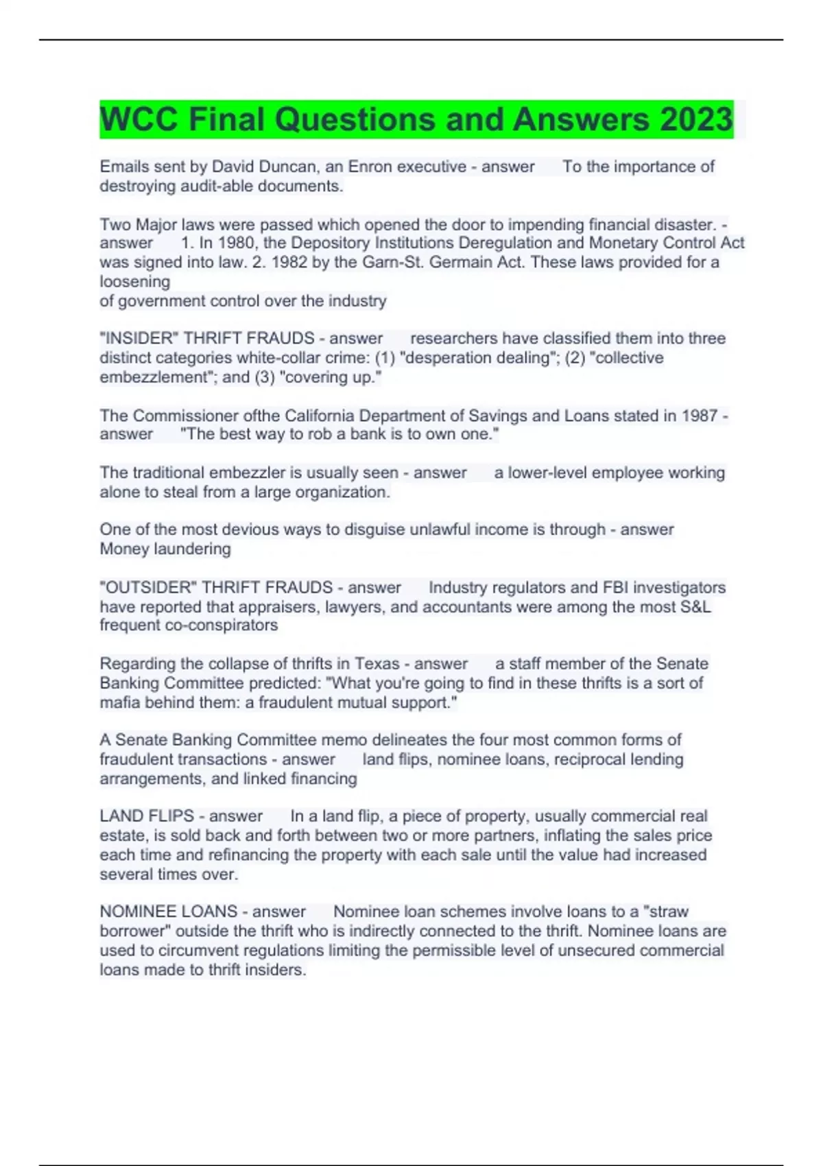 WCC Final Questions and Answers 2023 Emails sent by David Duncan, an Enron executive To the importance of destroying audit-able documents. Two Major laws were passed which opened the door to impending financial disaster. 1. In 1980, the Depository Institutions Deregulation and Monetary Control Act was signed into law. 2. 1982 by the Garn-St. Germain Act. These laws provided for a loosening of government control over the industry "INSIDER" THRIFT FRAUDS researchers have classified them into three distinct categories white-collar crime: (1) "desperation dealing"; (2) "collective embezzlement"; and (3) "covering up." The Commissioner ofthe California Department of Savings and Loans stated in 1987 "The best way to rob a bank is to own one." The traditional embezzler is usually seen a lower-level employee working alone to steal from a large organization. One of the most devious ways to disguise unlawful income is through Money laundering "OUTSIDER" THRIFT FRAUDS Industry regulators and FBI investigators have reported that appraisers, lawyers, and accountants were among the most S&L frequent co-conspirators Regarding the collapse of thrifts in Texas a staff member of the Senate Banking Committee predicted: "What you're going to find in these thrifts is a sort of mafia behind them: a fraudulent mutual support." A Senate Banking Committee memo delineates the four most common forms of fraudulent transactions land flips, nominee loans, reciprocal lending arrangements, and linked financing LAND FLIPS In a land flip, a piece of property, usually commercial real estate, is sold back and forth between two or more partners, inflating the sales price each time and refinancing the property with each sale until the value had increased several times over. NOMINEE LOANS Nominee loan schemes involve loans to a "straw borrower" outside the thrift who is indirectly connected to the thrift. Nominee loans are used to circumvent regulations limiting the permissible level of unsecured commercial loans made to thrift insiders. RECIPROCAL LENDING Reciprocal lending arrangements are similarly designed to evade restrictions on insider loans. LINKED FINANCING Finally, linked financing is "the practice of depositing money into a financial institution with the understanding that the financial institution will make a loan conditioned upon receipt of the deposits. These transactions usually involved brokered deposits in packages of$100,000, the limit on FSLIC insurance. The collapse of Lincoln Savings and Loan of Irvine, California. the most expensive thrift failure (a more than $3 billion cost to taxpayers), is notorious not only because of its massive losses, but because it serves as a prime example of all the excesses and corruption (Charles Keating) Lincoln Savings owner Charles Keating Keating purchased Lincoln and Savings with Junk Bonds Sold by Michael Milken Lincoln traded in junk bonds quickly transformed it from a traditional small thrift that made home mortgage loans into his own (and his family's) personal money machine. Keating's "masterpiece" Phoenician Hotel in Scottsdale, Arizona. American Continental Corporation. A fraudulent mortgage corporation which keating fund from his Lincoln Savings and loan company. Keating contributed $1.4 million to the campaigns and causes of five U.S. Senators who would later become known as "Keating Five. They were: Alan Cranston Dennis DeConcini, Don Riegle, John McCain, and John Glenn. Another meeting took place a week later with the full Keating Five, One of the regulators, Bill Black, took meticulous notes at the meeting which clearly indicate that the senators were attempting to thwart the government agency action regarding Lincoln. Alan Bond,former CEO of Albriond Capital Management was sentenced to 12 years in prison in 2002 for cheating pension funds out of millions of dollars Bond was convicted ofdefrauding clients by sending unprofitable securities trades to their accounts while directing most of the profitable ones to himself. In investment fraud parlance, this scheme is known as "cherry picking ... One of the largest pension fund scams occurred in California. By First Pension Corporation of Irvine First Pension was run by Businessman William E. Cooper In 1995, investors filed a class-action lawsuit against the California Corporations Department, which regulates businesses in that state, charging negligence in handling First Pension Cooper was sentenced to a 10 year prison term, while Lindley and Jensen were sentenced to nine and four years, respectively. "premium diversion common form of fraud,where by funds intended to cover claims are diverted for other purposes. Generally, an insurance agent fails to send premiums to the underwriter and instead keeps the money for personal use. The Multiple Employer Welfare Arrangement (MEWA) was created by Congress to help small businesses obtain reasonably priced healthcare coverage for their employees. Investigators have found that some firms that administer MEWAs are fraudulent enterprises—"virtual money machines for the unscrupulous." Subprime mortgage market. the Clinton administration authorized subprime loans under the CRA. As a result, mortgage lenders relaxed the financial qualifications for buying a house and offered mortgage loans to credit impaired households, albeit at higher interest rates to compensate for the greater risk. Eugenics— The "improvement" of the human race through such practices as selective breeding and compulsory sterilization. The United States and Germany remain The only "civilized" Western nations in which sterilization laws were enforced Between 1924 and 1972, the state of Virginia Sterilized over 8,300 mentally retarded citizens. 1927 ruling in Buck v. Bell This case involved the first victim of Virginia's Compulsory Sterilization Law—a teenage girl named Carrie Buck, who had been committed to the notorious Lynchburg Colony for Epileptics and the Feebleminded and subsequently was sterili